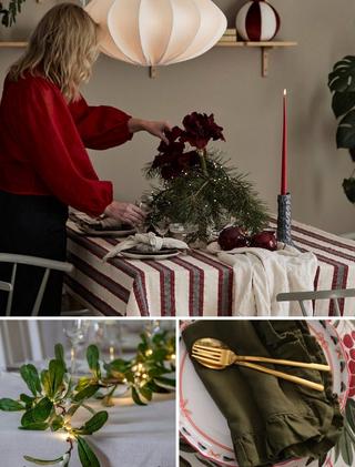 Kauniin joulupöydän luomisen ei tarvitse olla monimutkaista. Aloita perusasioista valitsemalla tekstiilit, kuten liina tai pöytäliina, jotka sekä suojaavat pöytää että määrittävät koko kattauksen värimaailman. Mieti sitten tarjoilua, yhtenäiset tarjoiluastiat ja kulhot luovat rauhallisen ja järjestelmällisen vaikutelman, kun ruoka laitetaan esille. Dynaamisemman tunnelman luomiseksi voit parantaa esillepanoa käyttämällä eri korkeuksia yhdistämällä korkeita kynttilänjalkoja matalampiin tuikkulyhtyihin. Joulun valaistus on myös tärkeä yksityiskohta, varmista, että kattovalaisin antaa miellyttävää valoa, joka täydentää eläviä kynttilöitä. Viimeistele pienillä harkituilla yksityiskohdilla, jotka sitovat kokonaisuuden yhteen, kuten kuusen oksa jokaisella lautasella tai yksinkertainen paikkakortti.