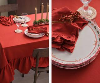 Klassinen punainen joulukattaus on ajaton ja suosittu vaihtoehto. Tyylin luomiseksi aloita kestävällä puuvillaisella joululiinalla ja täydennä se valkoisilla posliinilautasilla, jotka ovat joko täysin sileitä tai joissa on hillitty kultareuna. Punaiset lautasliinat ja yksinkertaiset, kiillotetut ruokailuvälineet sopivat hyvin yhteen. Korkeuden lisäämiseksi pöytään käytä perinteisiä messinki- tai hopeakynttilänjalkoja.