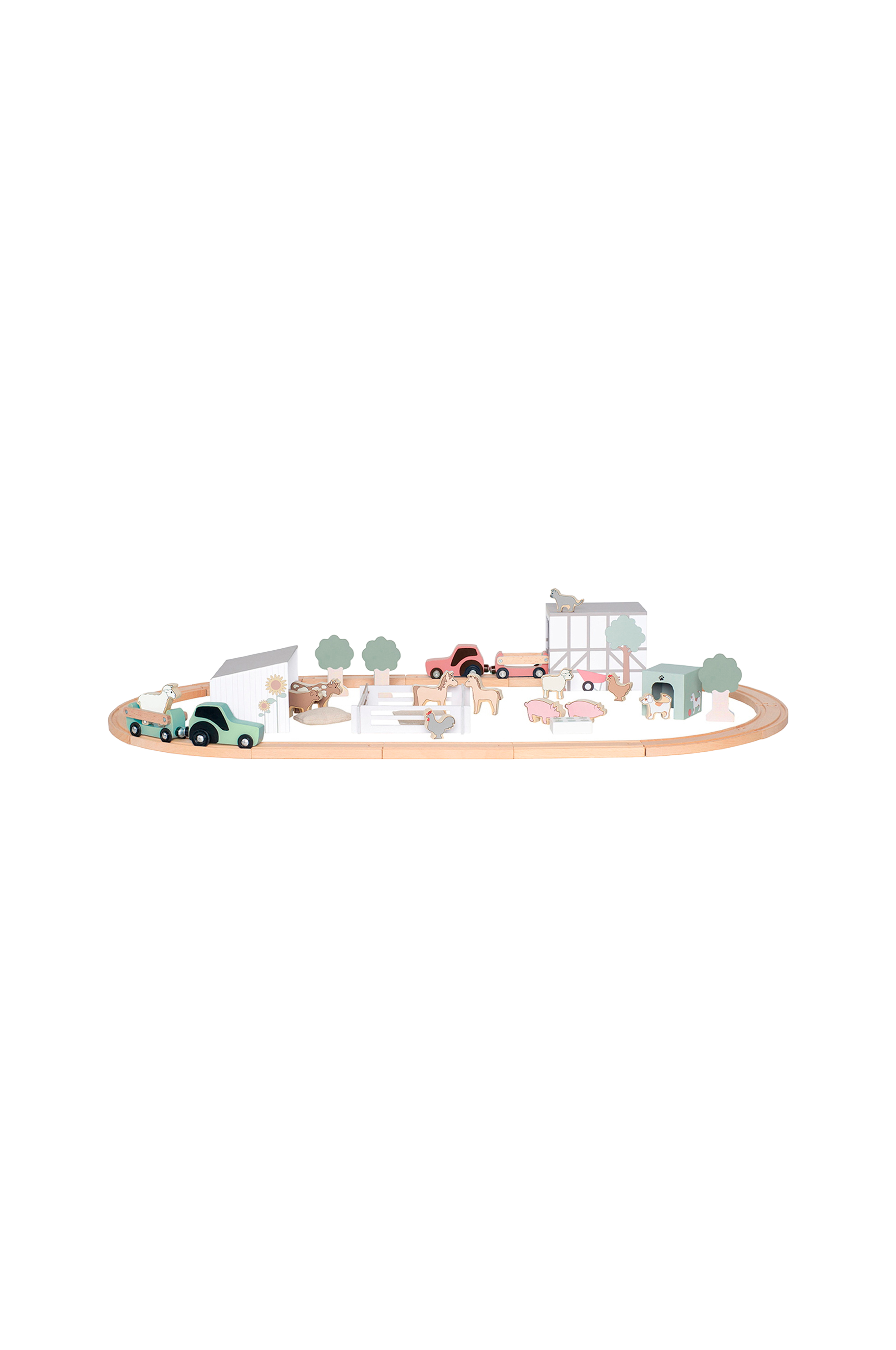 Puinen junarata ja maatila eläimineen.