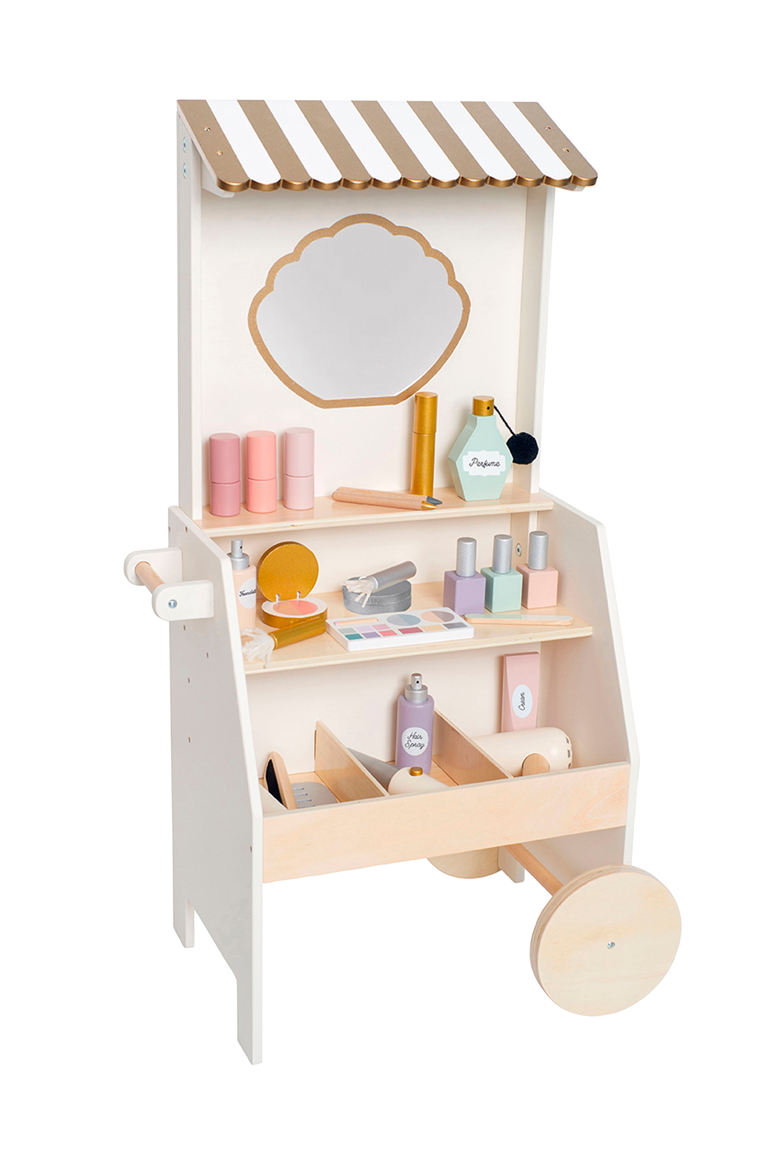 Kaikki tarvikkeet on valmistettu puusta, mikä takaa sotkuttomat leikit. Salongissa on pyörät ja kahva, joten sitä on helppo siirtää
