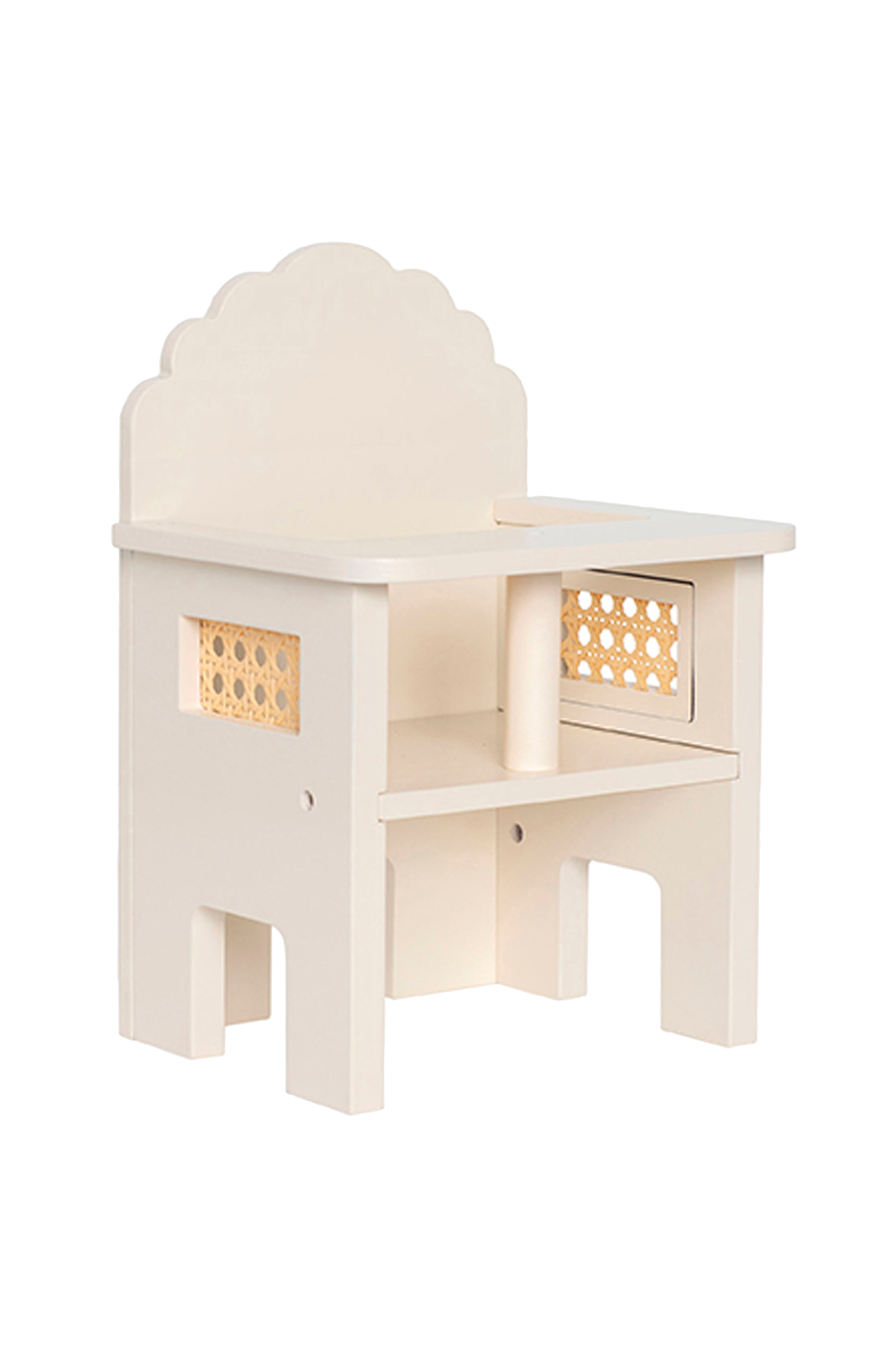 Kermansävyinen puinen nuken tuoli, jossa koristeelliset rottinkia muistuttavat yksityiskohdat.