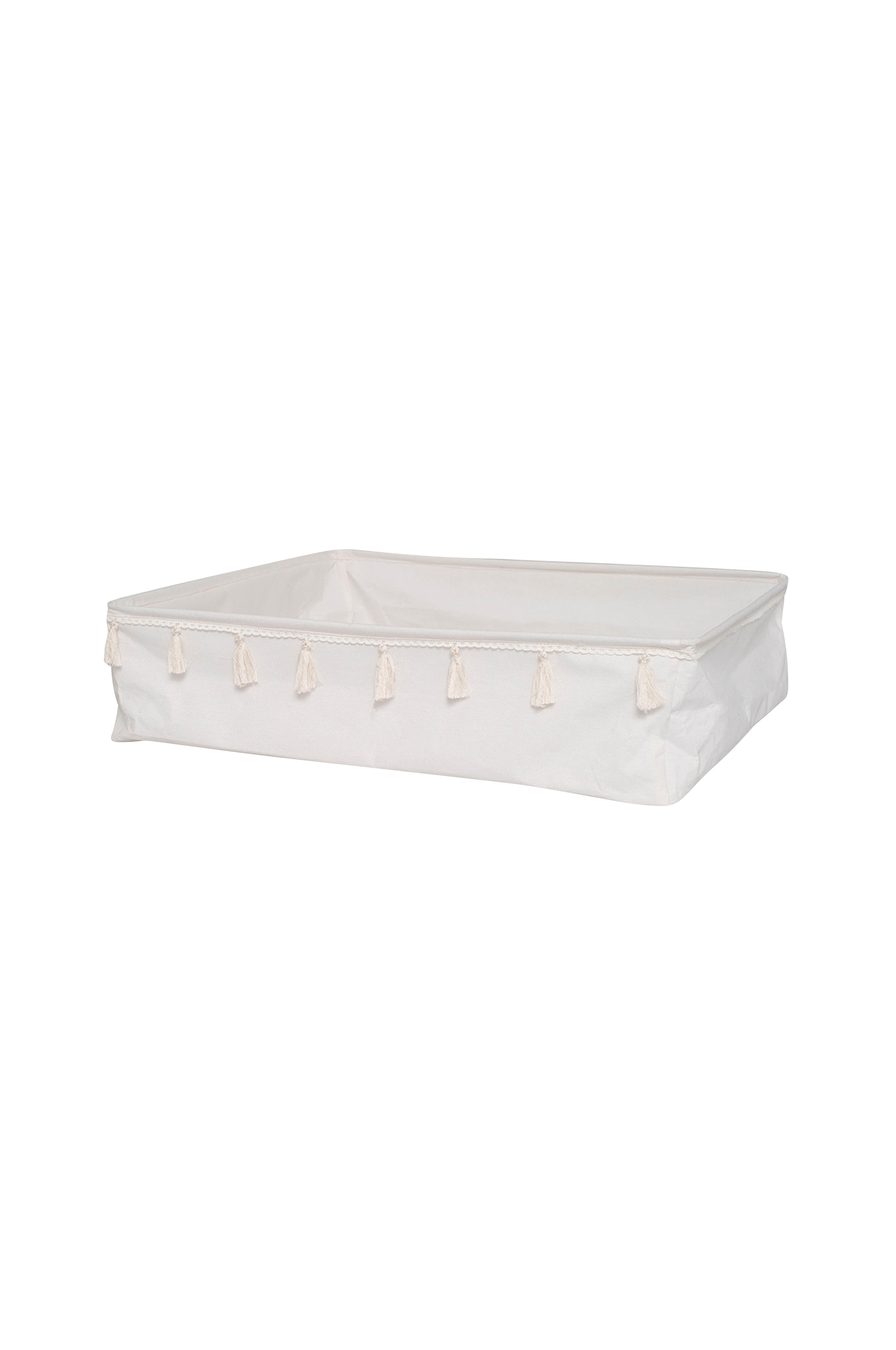 Laatikko on valmistettu pehmeästä kankaasta ja helppo taittaa kasaan tilan säästämiseksi silloin, kun se ei ole käytössä. Toisella sivulla on kauniit kankaiset koristehapsut.