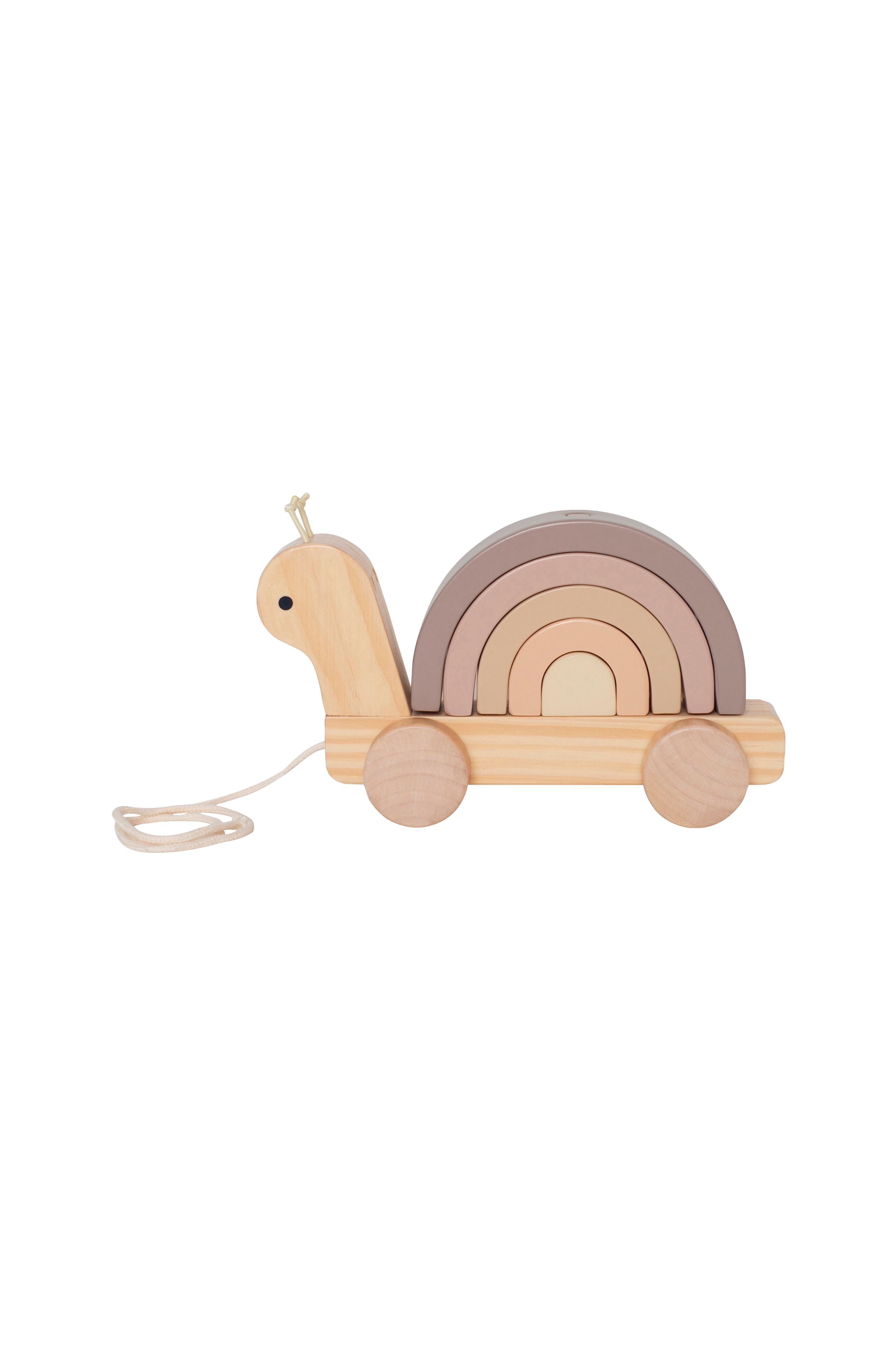 Sievä puinen vedettävä leluetana, jolla on selässään pinottava sateenkaari.