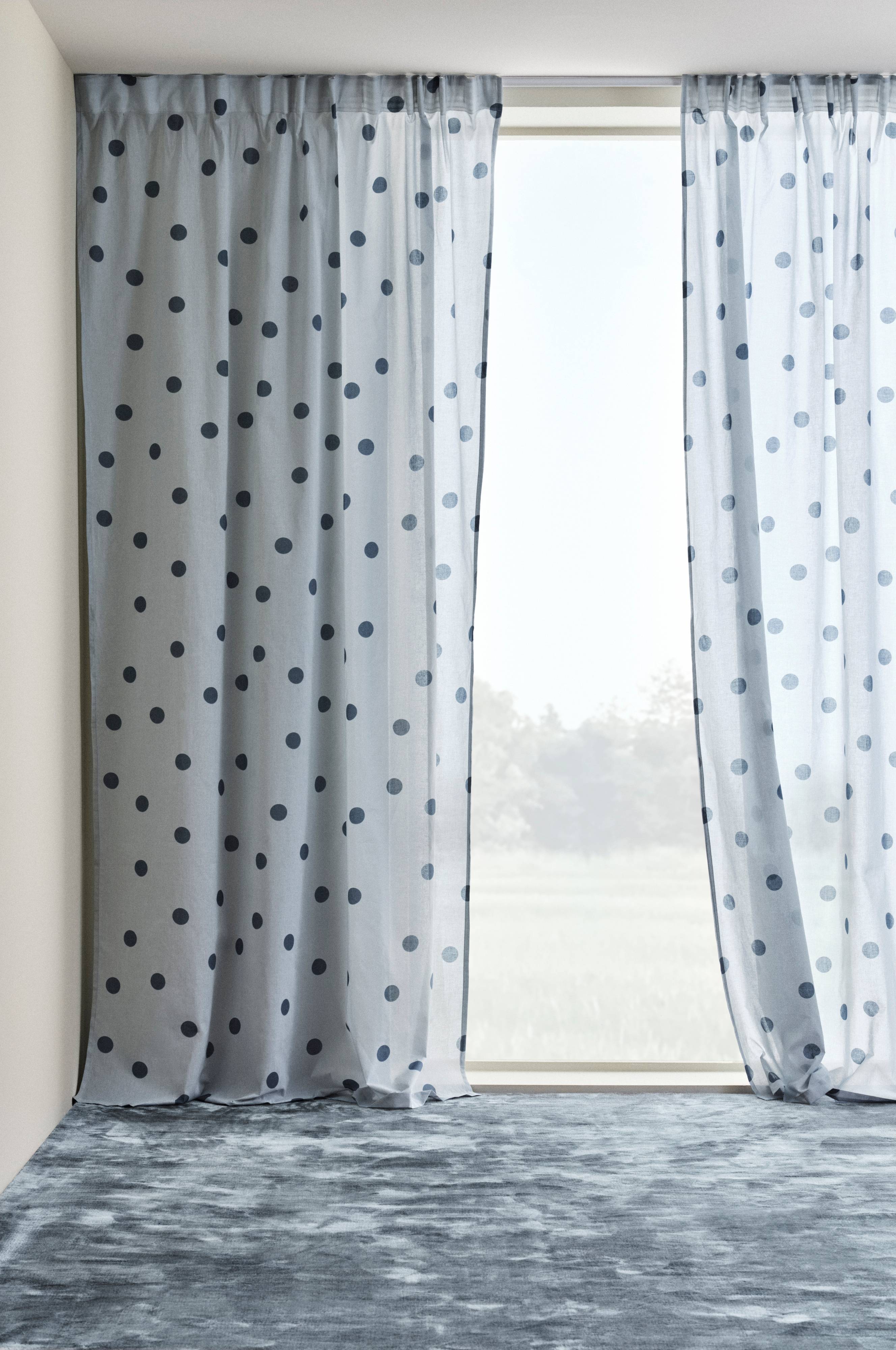 Kaksi puuvillaista sivuverhoa, joissa painettu, sointuvan värinen pilkkukuvio. Klassinen pilkullinen kuvio on aina muodissa. Verhoissa on päälleommeltu monitoiminauha, ja ne voidaan ripustaa sormikoukkujen, kujan tai piilolenkkien avulla.