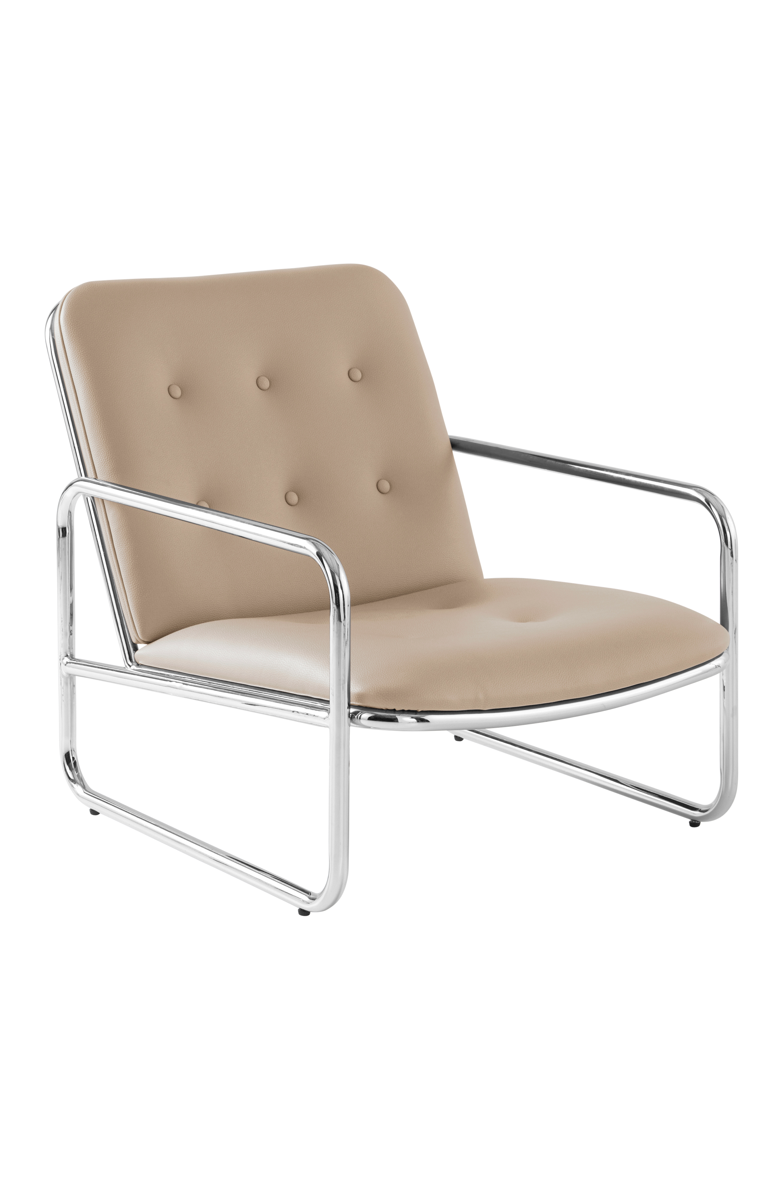 ALMELO-nojatuoli on tyylikäs keinonahkainen nojatuoli, jonka runko on valmistettu tukevista, kromatuista rautaputkista. Istuin ja selkänoja on pehmeästi pehmustettu ja verhoiltu viihtyisällä keinonahalla. ALMELO:ssa on mukava retrotunnelma kromin ja raskaan kankaan yhdistelmällä, jossa on syvälle niitattuja nappeja.