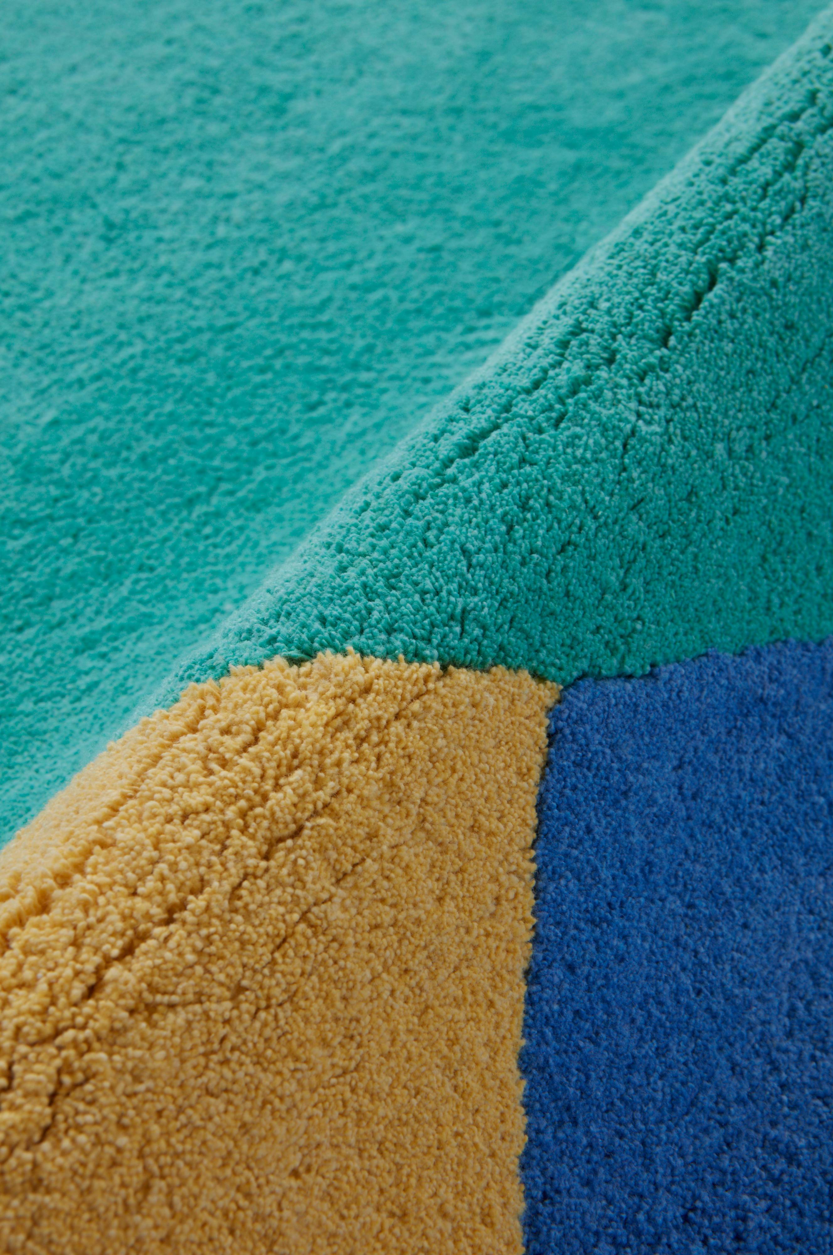 Käsin tuftatussa puuvillamatossa, jossa on pehmeä kasa, on värikkäitä geometrisia ympyröitä. Sen päällä on mukava istua ja se sopii hyvin lastenhuoneisiin.
