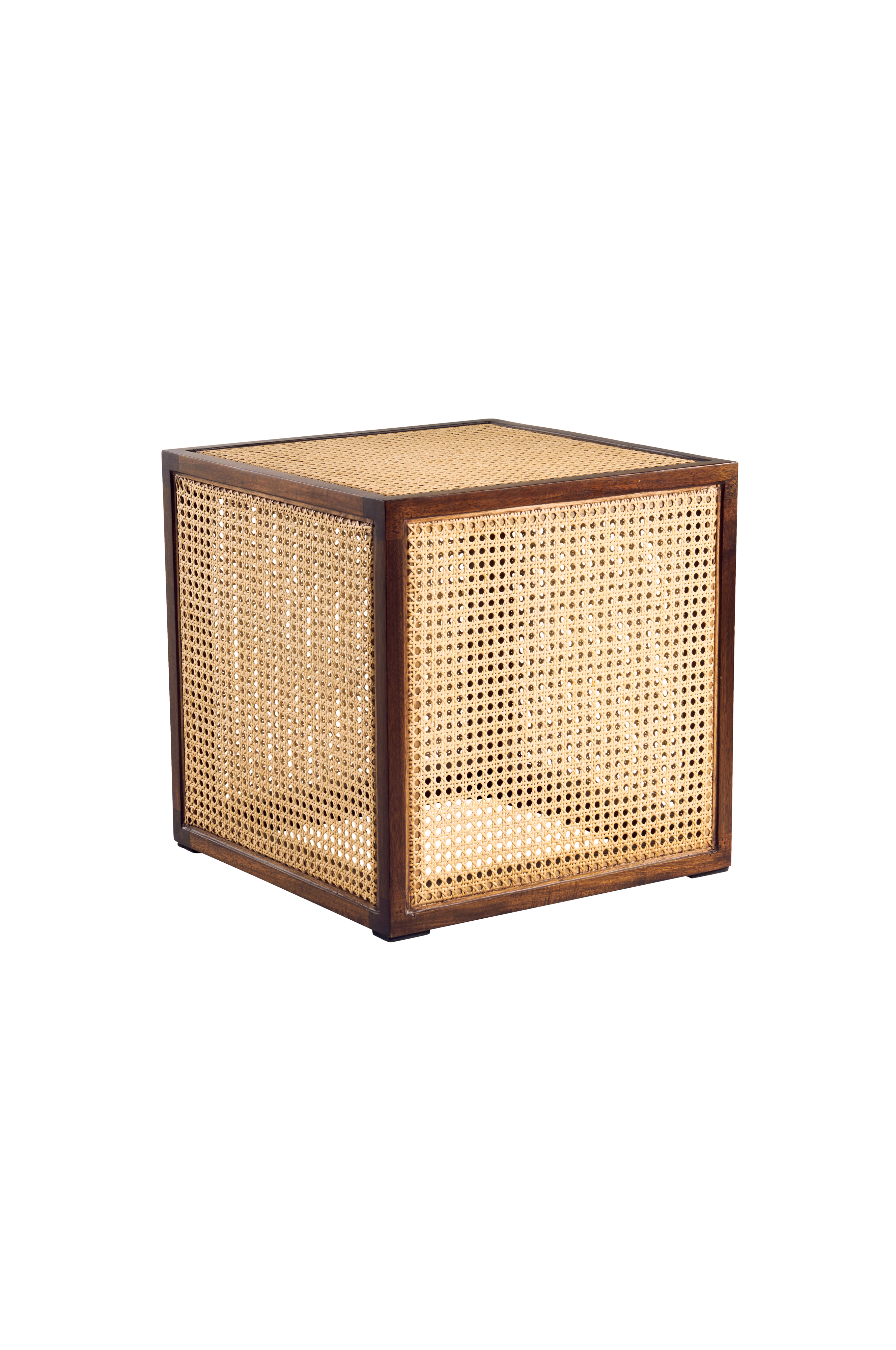 Kuutionmuotoinen pöytä mangopuuta, sivuilla ja ylhäällä rottinkia. Tyylikäs pieni pöytä, jonka avulla on helppo sisustaa ja luoda hauskoja ratkaisuja.