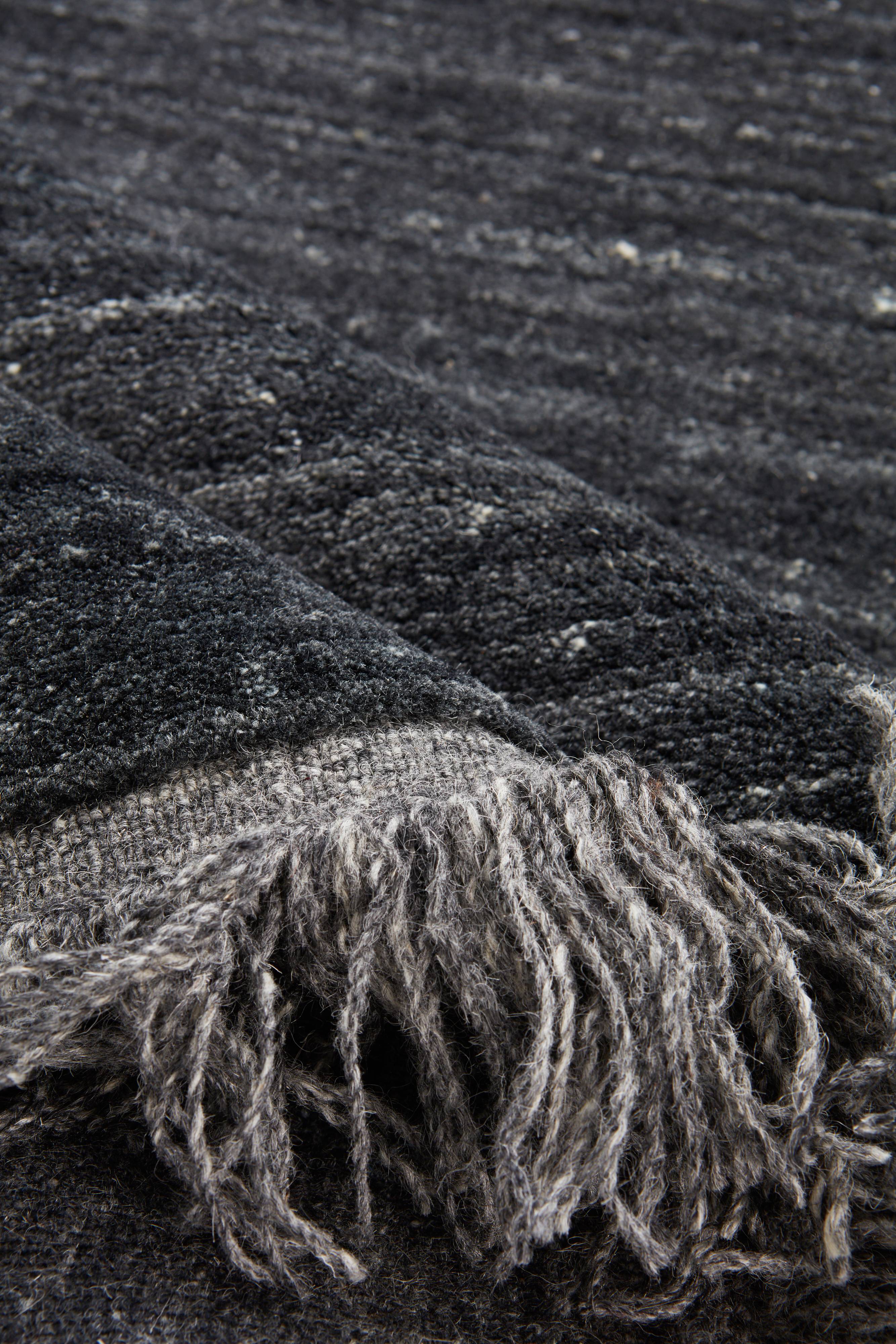 Käsin solmittu matto pehmeää villaa, jossa hieman viskoosia joukossa. Matossa on vaihtelevat sävyt, meleerattu raidoitus ja kaunis hapsureuna. Hapsujen pituus: 7,5 cm. Paksuus: 18 mm. 3000 g/m².