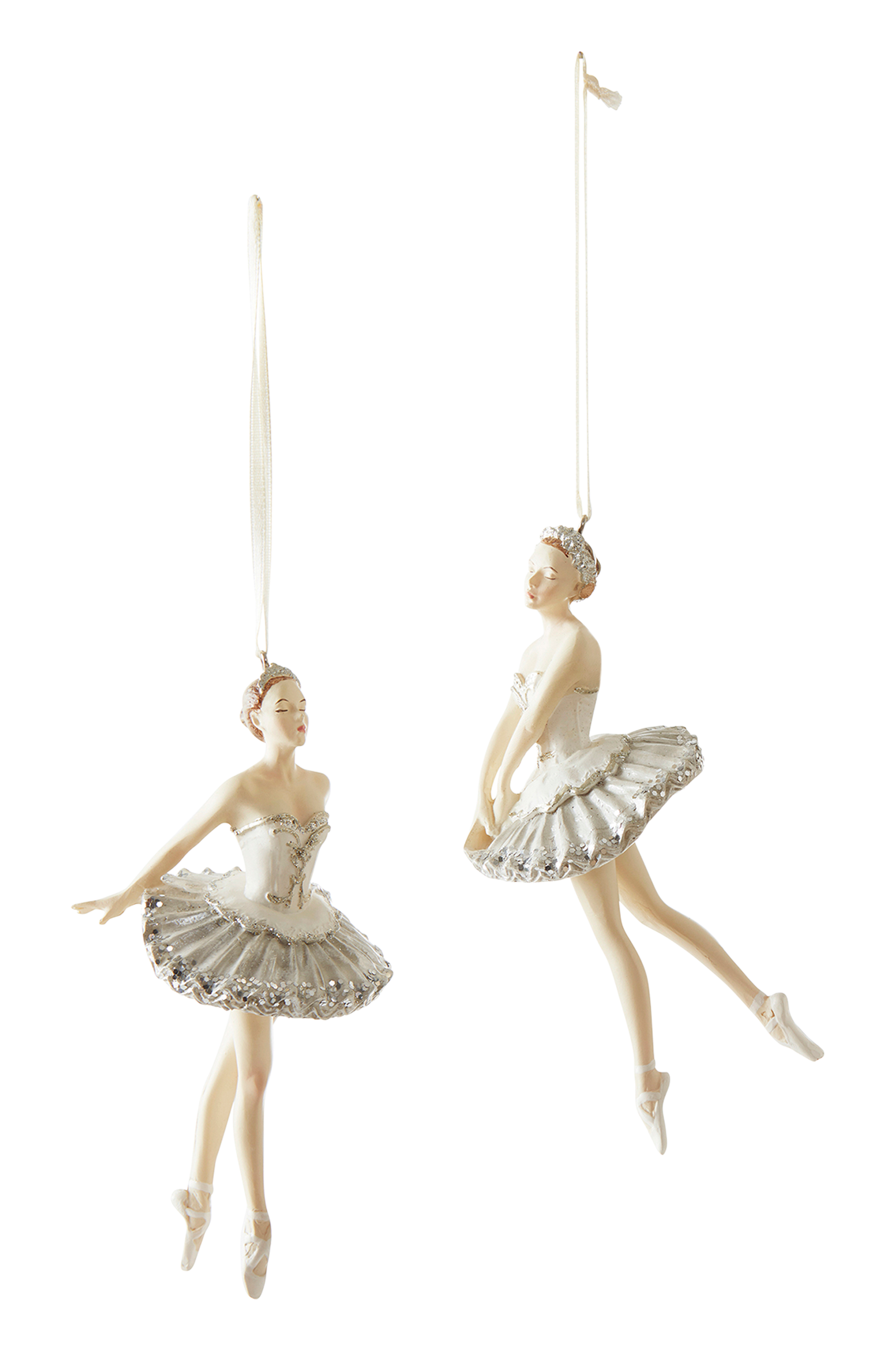 Kaksi kappaletta balettitanssijoita polyresiiniä. Hopean ja valkoisen hennot sävyt valaisevat joulukuusen.