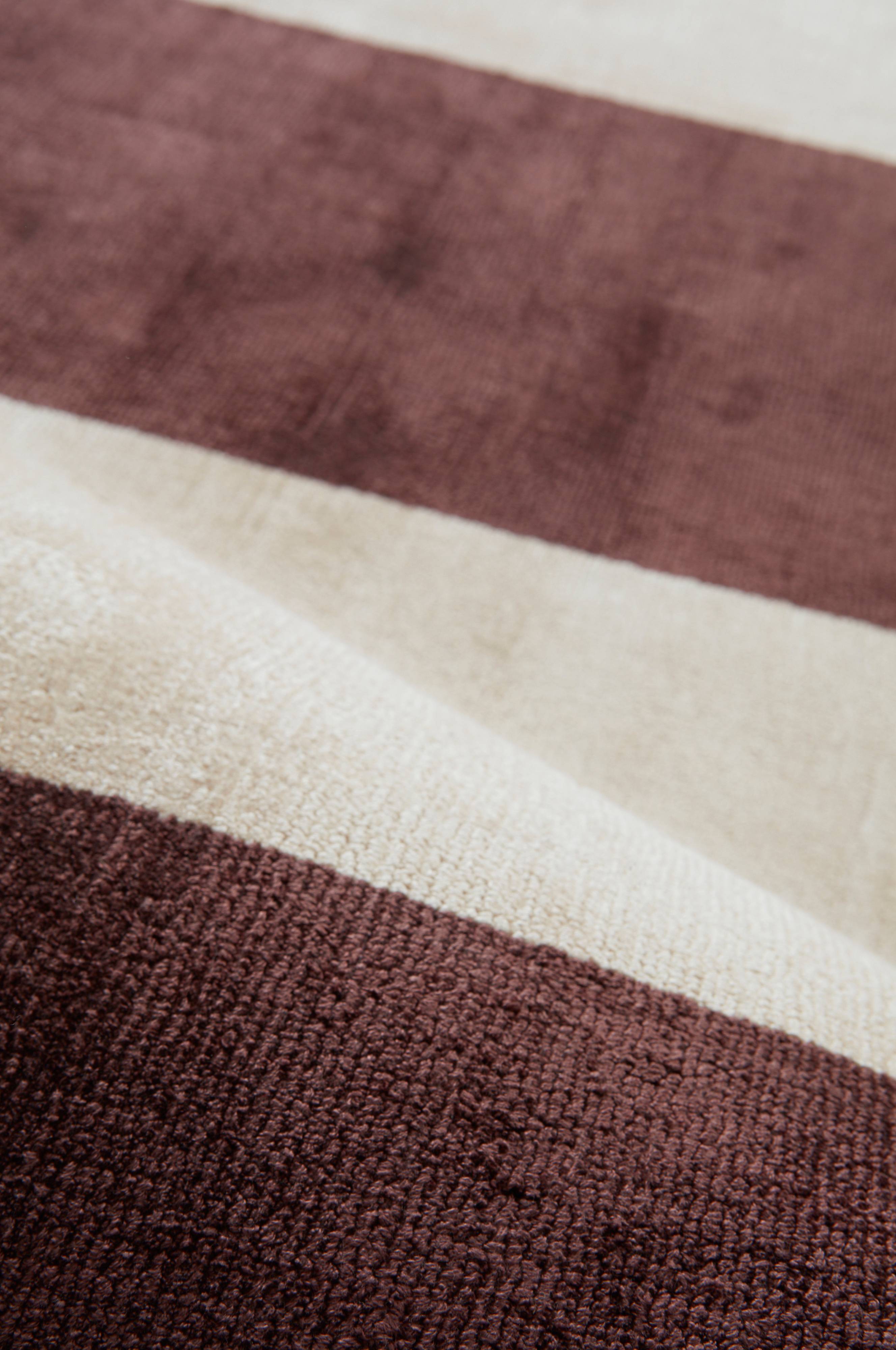BANDA on käsinkudottu viskoosimatto, jossa on näyttävät palkkiraidat. Ihanan pehmeä ja kiiltävä matto. Jokainen käsinkudottu matto on ainutlaatuinen. Nukan pituus 0,5-0,6 cm. Paksuus 1-1,1 cm. 2000 g/m².