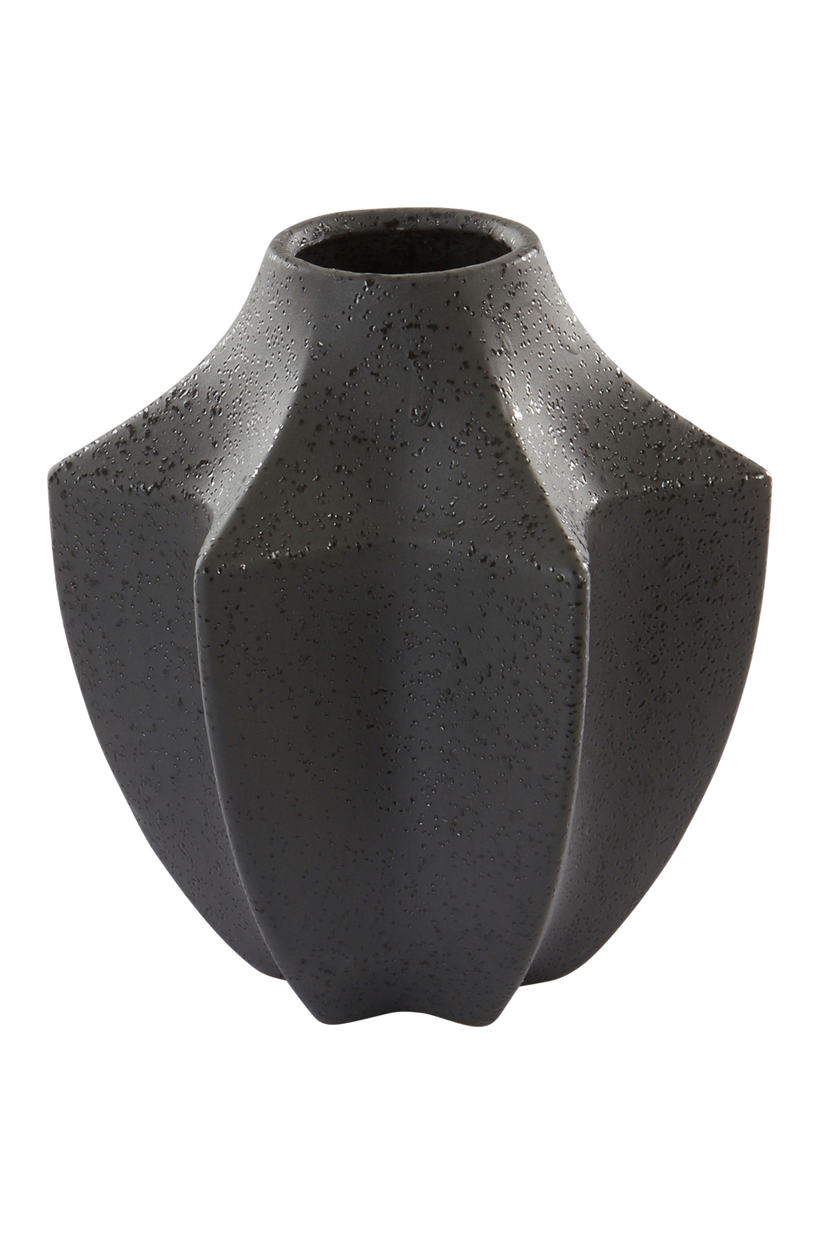 Tähdenmuotoinen maljakko kivitavaraa. Tummanharmaa mattapinta, jossa kiiltävä roiskekuvio. Maljakon upea muoto on yhtä koristeellinen kukkien ja oksien kanssa, kuin tyhjänä. Kivitavara voi päästää kosteutta läpi.