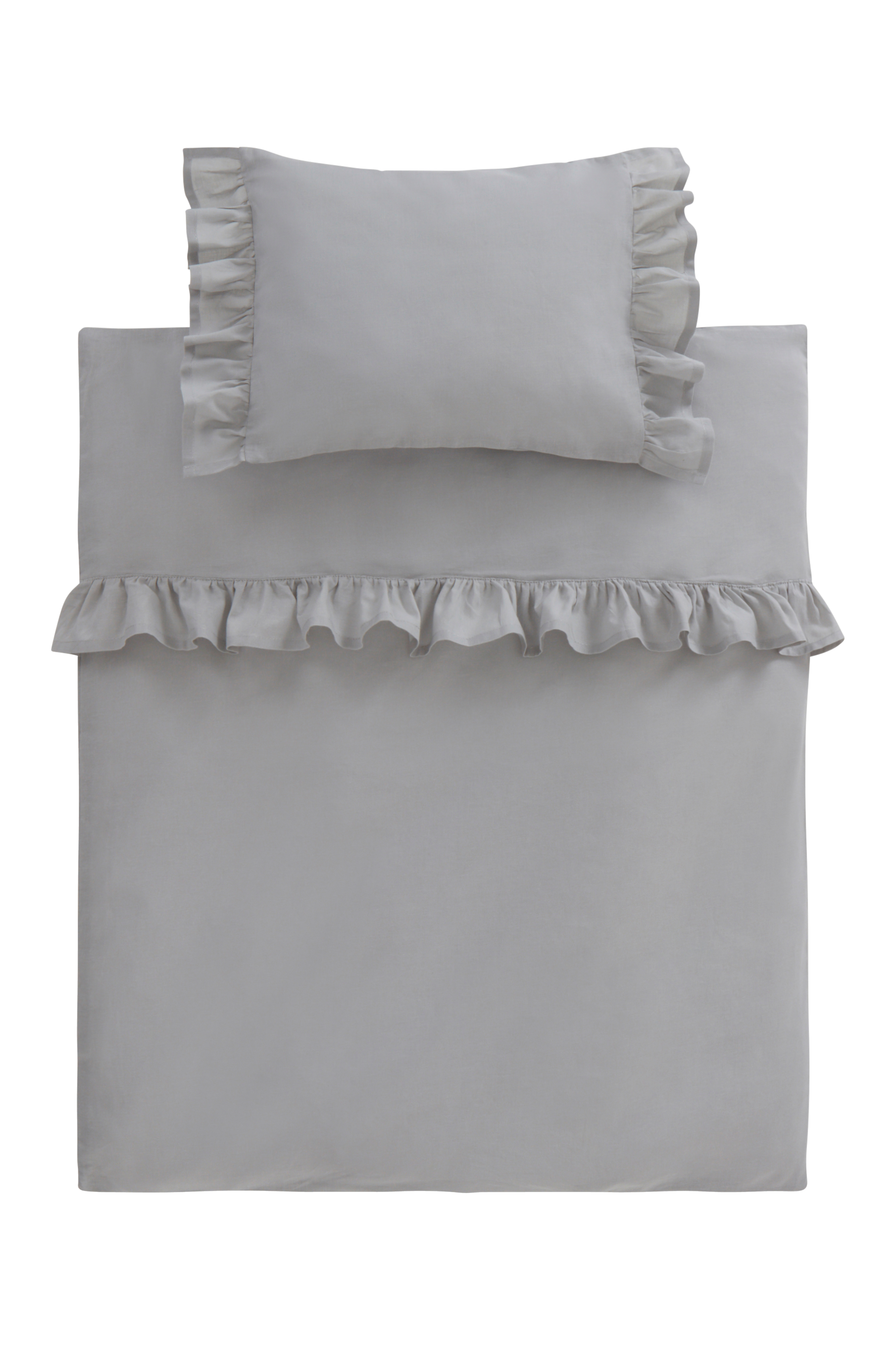 2-osainen pussilakanasetti ekologista puuvillaa. Koristeellinen röyhelöreuna. Puuvilla tuntuu ilmavalta ja pehmeältä ihoa vasten. Pussilakanasetti sopii lastenvaunuihin ja kehtoon. Langantiheys 144 tc. (Langantiheys kertoo lankojen lukumäärän, thread counts, neliötuuman alalla. Mitä suurempi langantiheys, sitä laadukkaampi materiaali.)