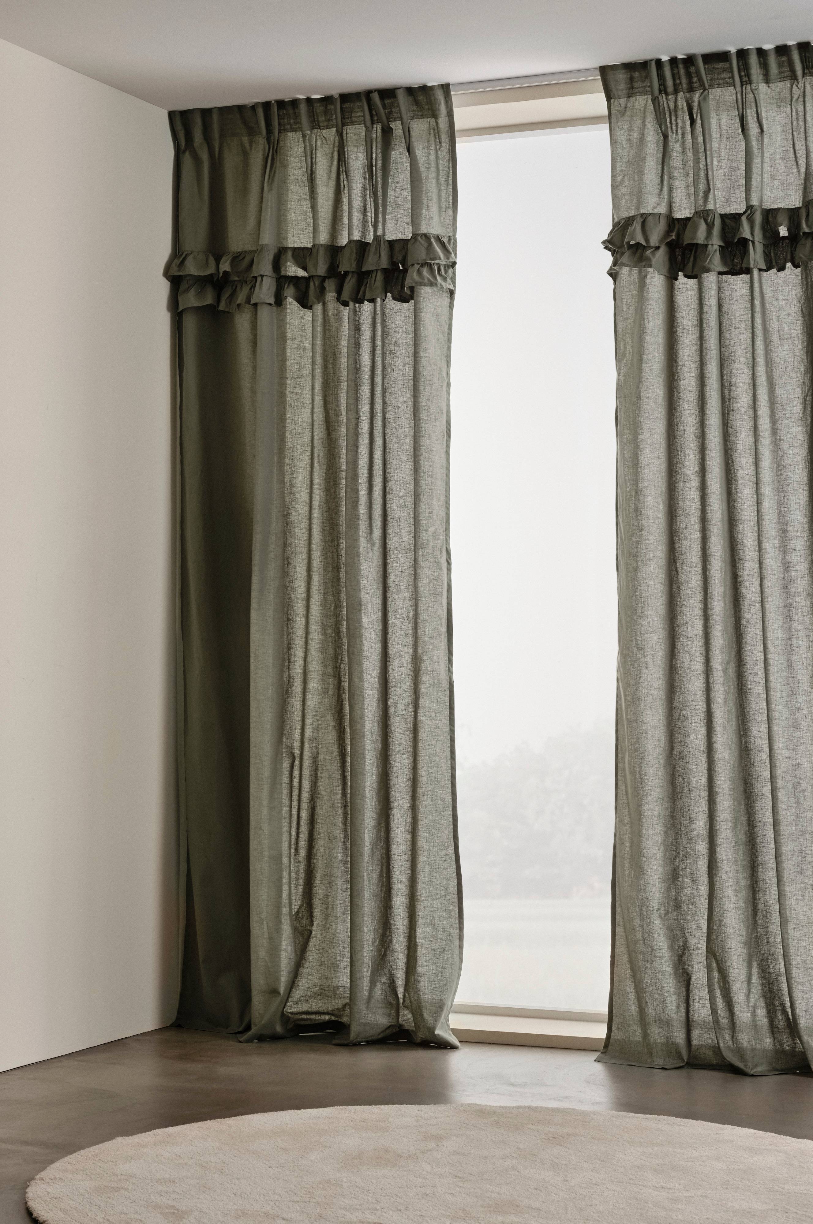 2-pakkaus verhojen pituuksia luomupuuvillaa. BILLY on yksivärinen verho, jossa on koristeellisia röyhelöelementtejä ja ommeltu monikäyttöinen nauha.