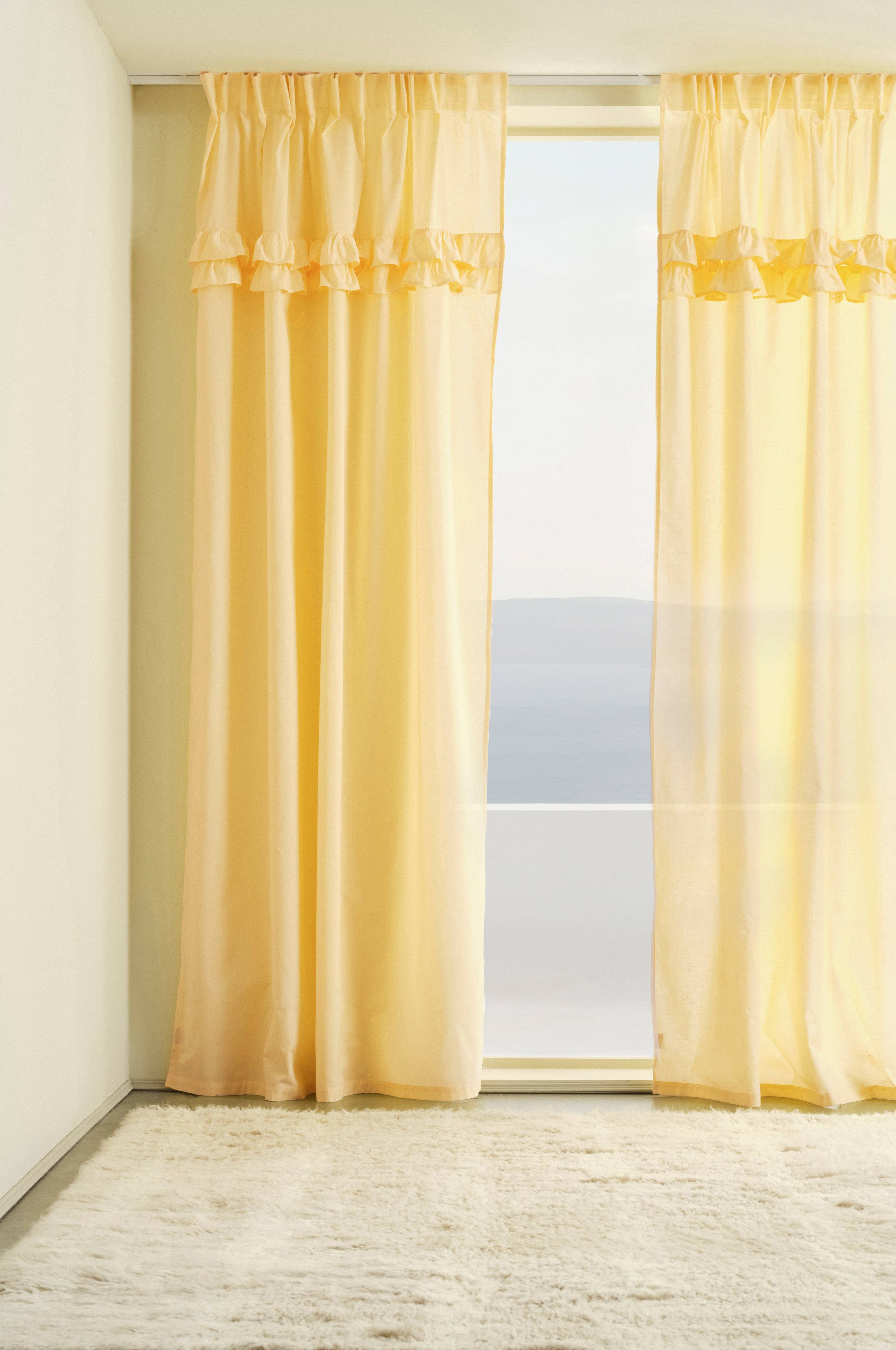 2-pakkaus verhojen pituuksia luomupuuvillaa. BILLY on yksivärinen verho, jossa on koristeellisia röyhelöelementtejä ja ommeltu monikäyttöinen nauha.