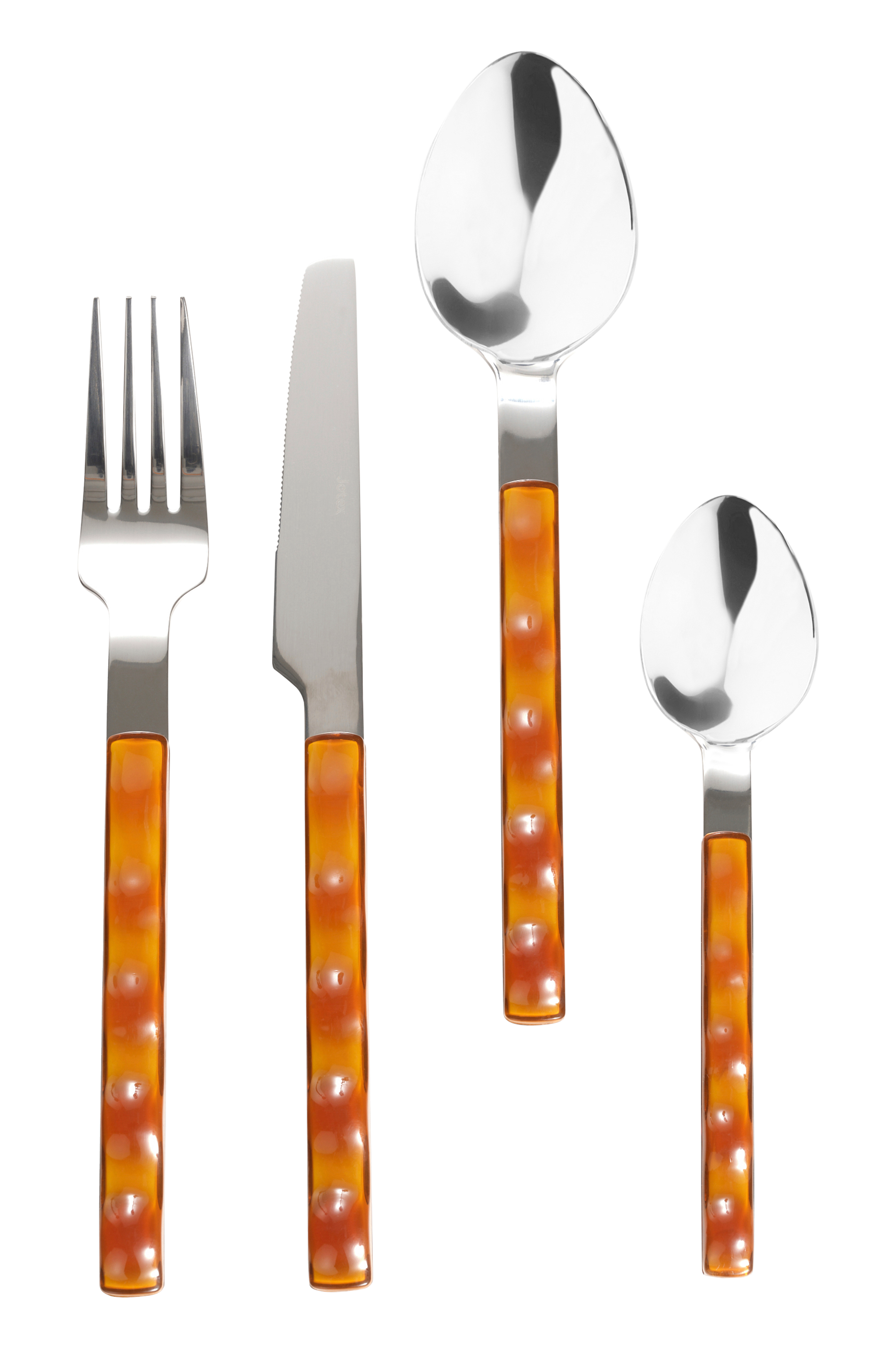BISQUE-ruokailuvälinesarjassa on viehättävä retromuotoilu ja kuplivat muovikahvat, jotka sopivat erinomaisesti nostalgiseen ruokailukokemukseen. Jokainen setti sisältää kuusi kappaletta haarukoita, veitsiä, ruokalusikoita ja teelusikoita, jotka tuovat ainutlaatuisen ja leikkisän lisän mihin tahansa pöytäasetelmaan.