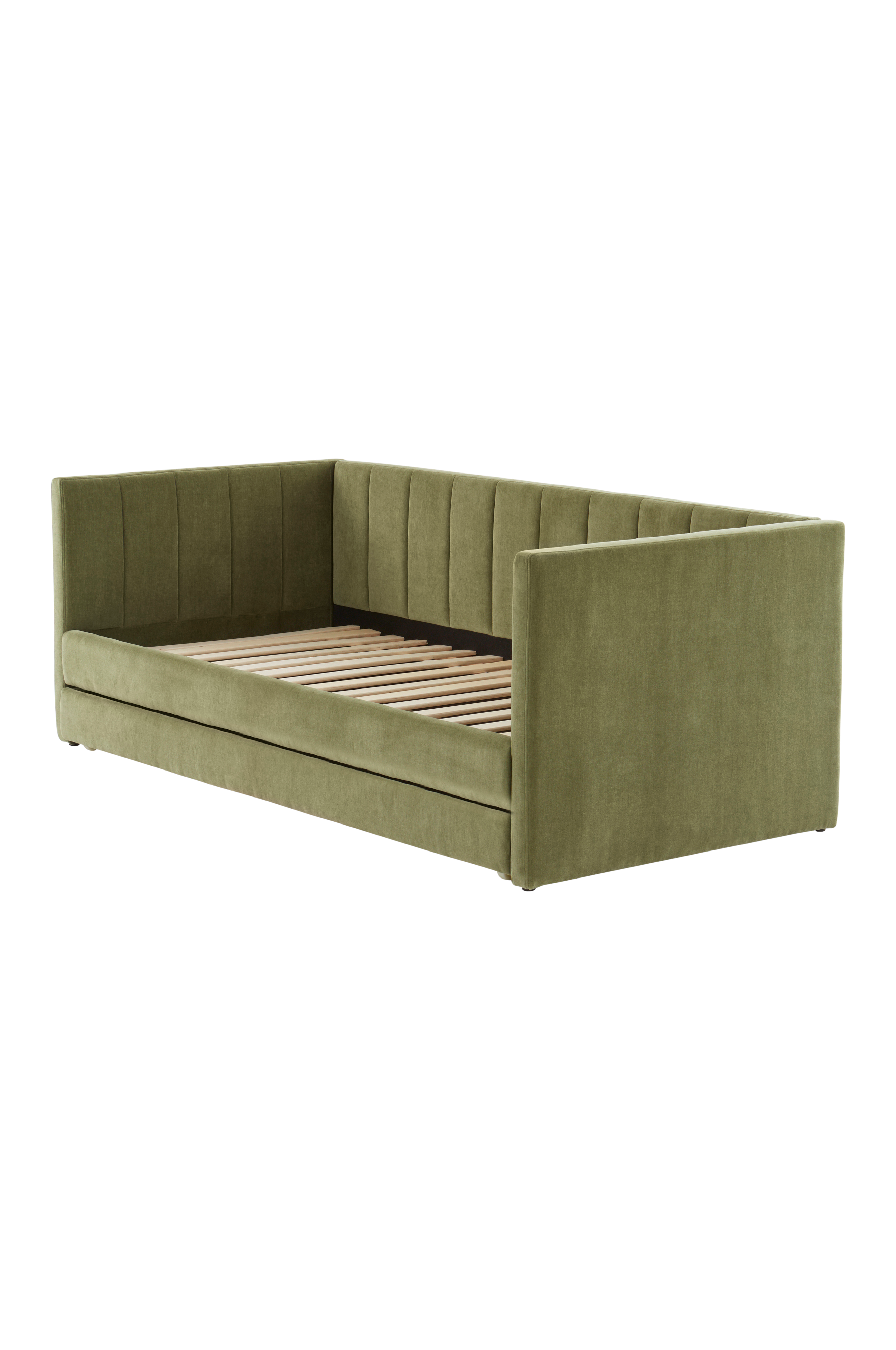 Runko ja sälepohja ovat FSC-sertifioitua mäntyä ja FSC-sertifioitua vaneria. Sänky on verhoiltu kauttaaltaan polyesterillä, josta puolet on peräisin kierrätetystä materiaalista. Sängyn kaikki sivut ovat pehmustettuja. Päällistä ei voi irrottaa. Pyörällinen varavuode on helppo vetää esiin, ja myös siinä on sälepohja. Alaosaa voidaan käyttää myös säilytystilana. Patjat eivät sisälly toimitukseen. Osittain koottava. Kokoamisohje mukana.