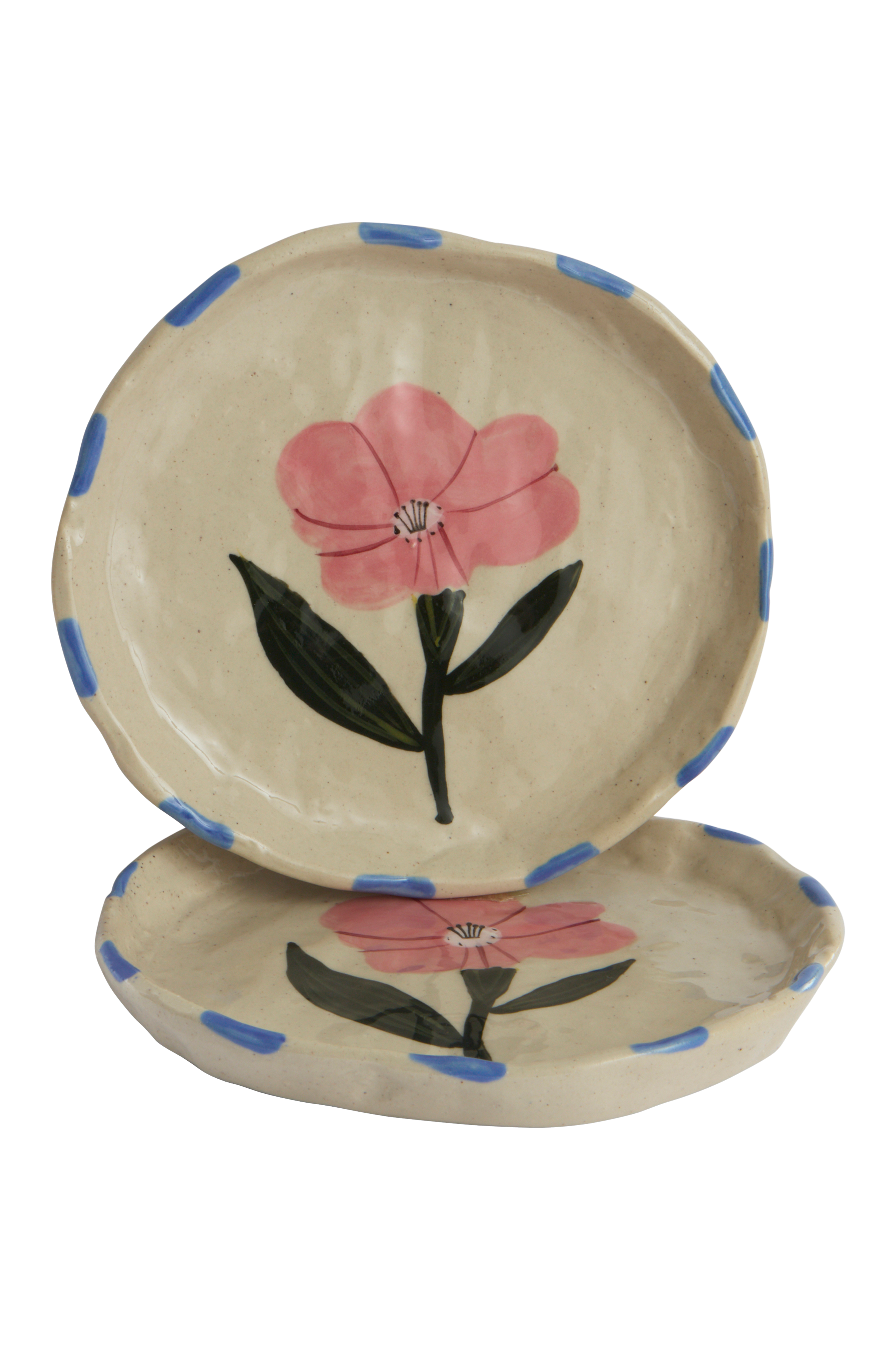 BOTANIC-sivulautasessa on valkoista keramiikkasavea, jossa on herkkä käsinmaalaus. Jokaisessa lautasessa on elävä vaaleanpunainen kukka, jossa on vihreitä lehtiä ja sinisiä korostuksia reunoilla. Yhdistä se muiden BOTANIC-malliston tuotteiden kanssa yhtenäistä ruokailukokemusta varten.