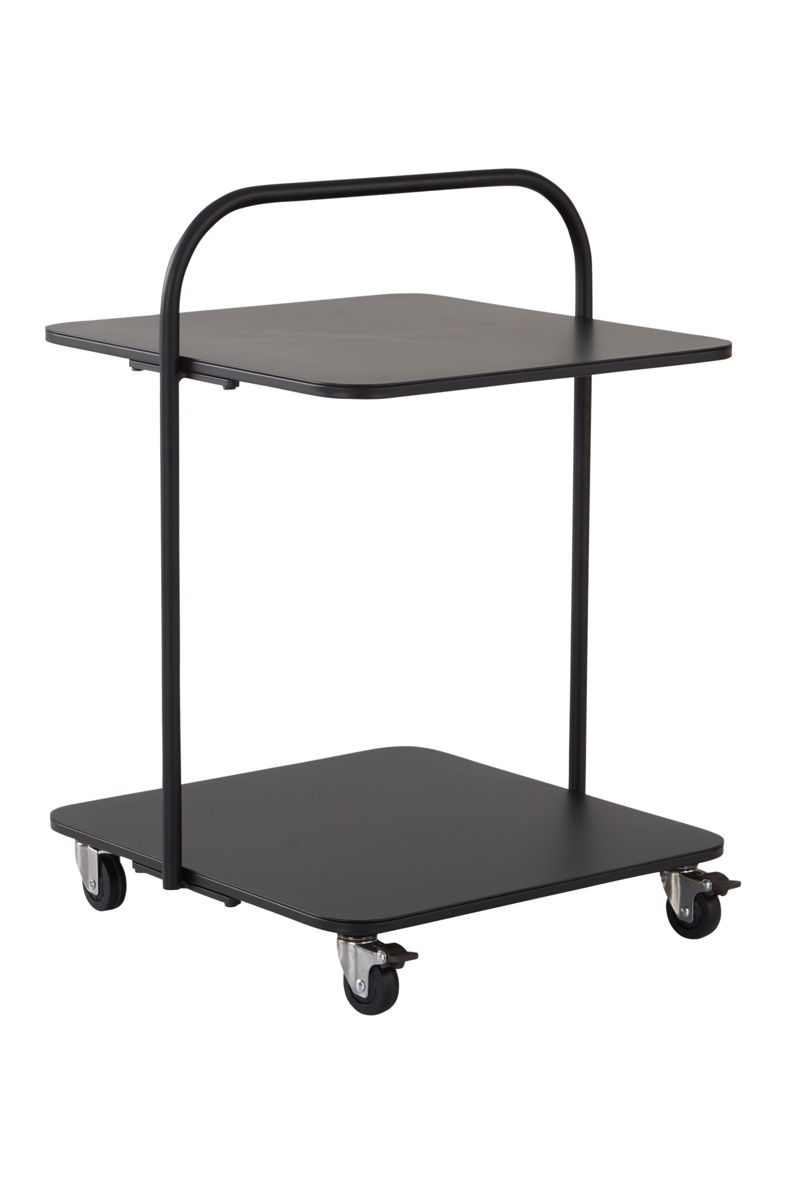 Pyörällinen sivupöytä, jossa laskutaso ja kahva ylhäällä. Käytännöllinen ja monikäyttöinen malli. Rautaisessa sivupöydässä on jauhemaalattu pinta. Neljä pyörää helpottaa siirtämistä, ja kaksi pyörää voidaan lukita pitämään pöytä paikoillaan. CLYDE on monikäyttöinen ja sopii sivupöydäksi sohvan viereen tai vaikka yöpöydäksi tai askartelupöydäksi. Helppo siirtää sivuun, kun sitä ei käytetä. Osittain koottava. Kokoamisohje mukana.