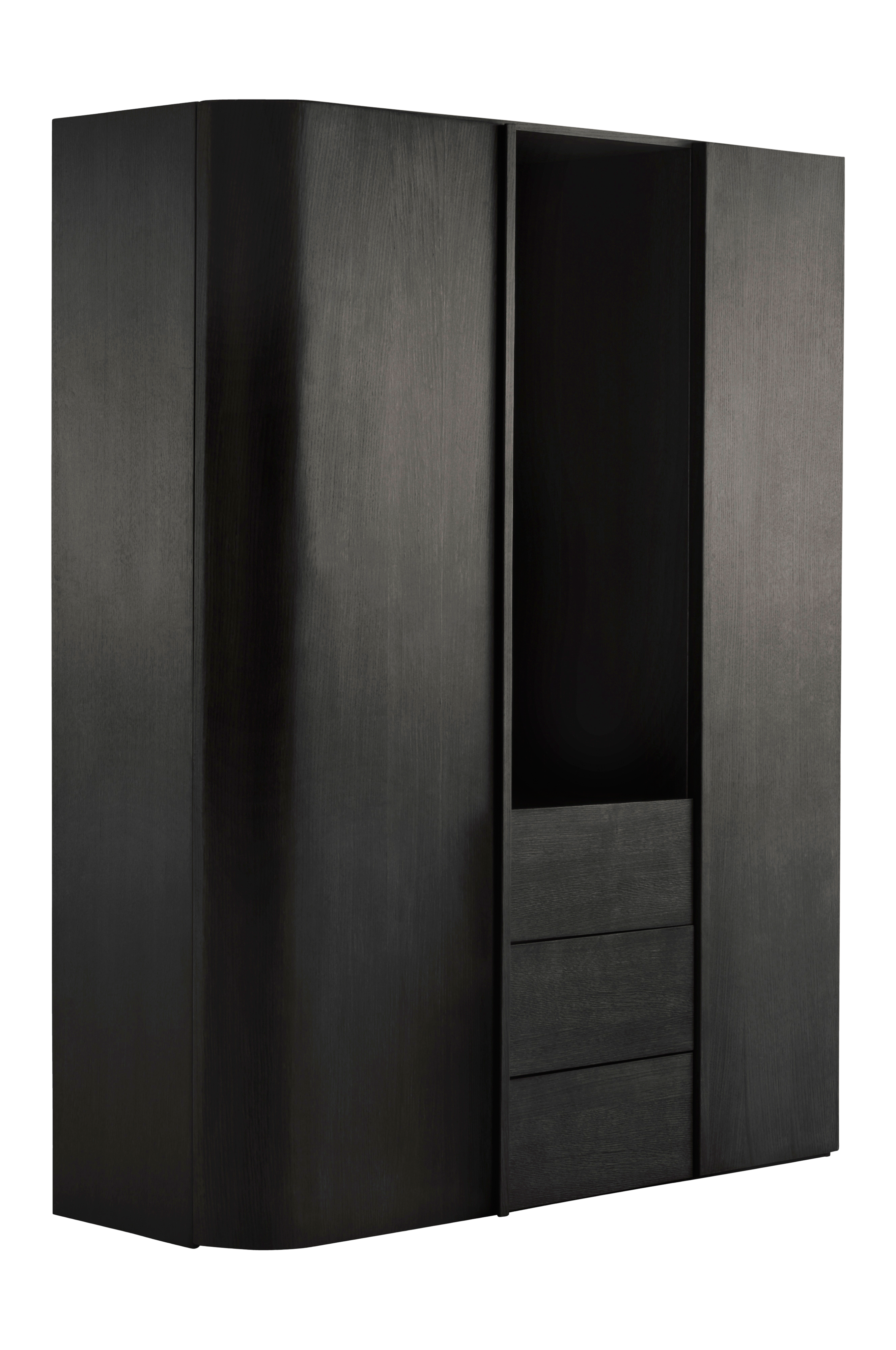 Vaatekaappi MDF-levyä, jossa tammiviilua esillä olevilla pinnoilla. BRAUX-vaatekaappi antaa näyttävän vaikutelman ja on tyylikäs säilytyskaluste, joka huokuu ylellisyyttä ja tyyliä. Etureunan pehmeästi pyöristetyt kulmat vahvistavat eleganttia ilmettä. Keskellä kolme laatikkoa ja vaatekaappi molemmilla puolilla. Laatikoiden yläpuolella oleva avoin tila antaa sinulle mahdollisuuden olla luova. Kenties sijoitat kauneimmat laukkusi sinne? Tai peilin?