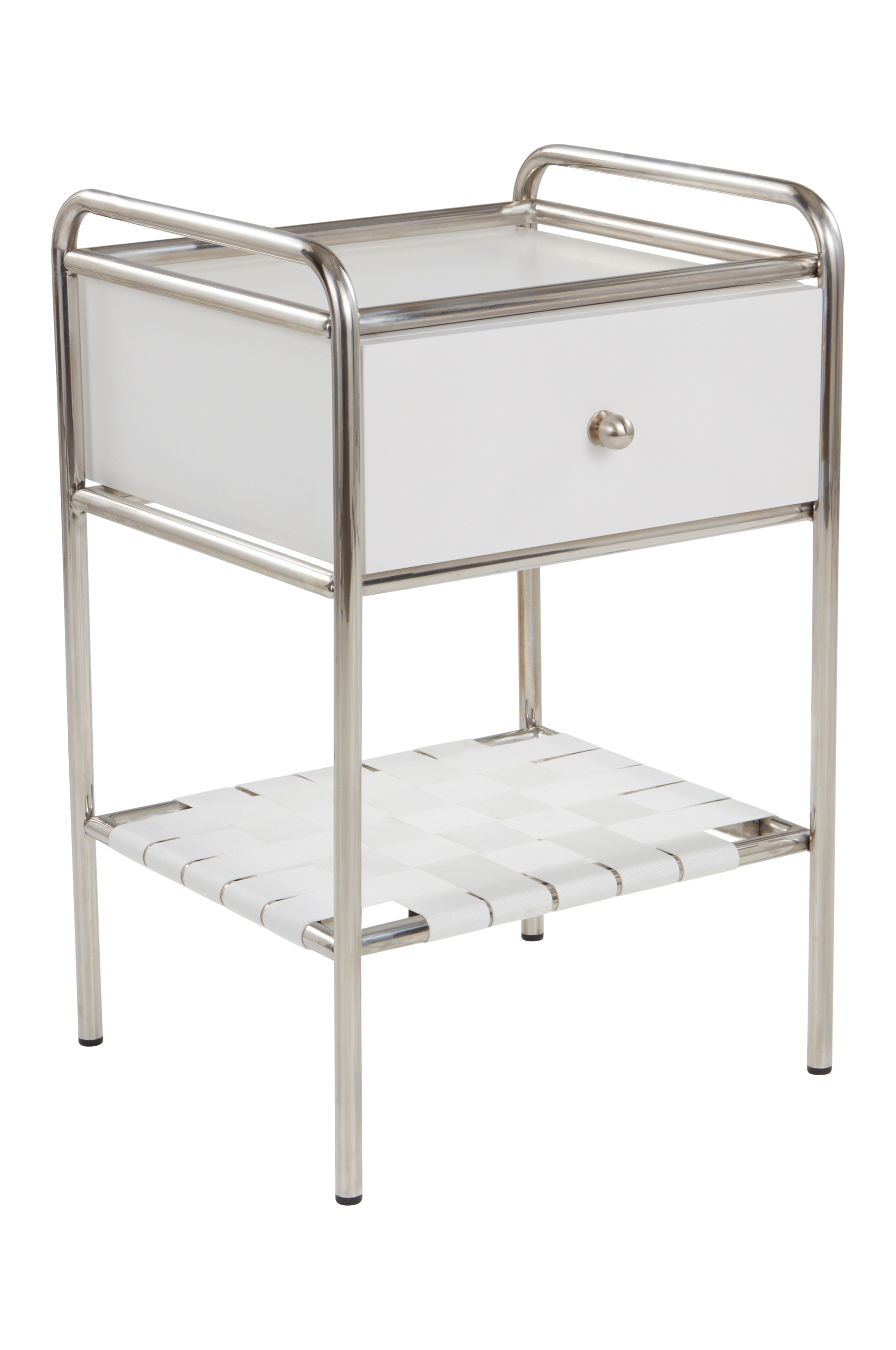 Trendikäs BREMEN-yöpöytä MDF-levyä. Krominväriset putket rungossa ja hyllyn punottu nauhakudos polyesteriä. Rungossa tyylikkäästi pyöristetyt kulmat ja putket ruostumatonta terästä. Tämä yhdessä säilytyslaatikon ja kestävästä nauhakudoksesta punotun hyllyn kanssa tekevät BREMEN-yöpöydästä erittäin käytännöllisen. Huonekalu sopii mainiosti sekä makuuhuoneeseen, eteiseen että olohuoneeseen. BREMEN sopii kaikkialle.