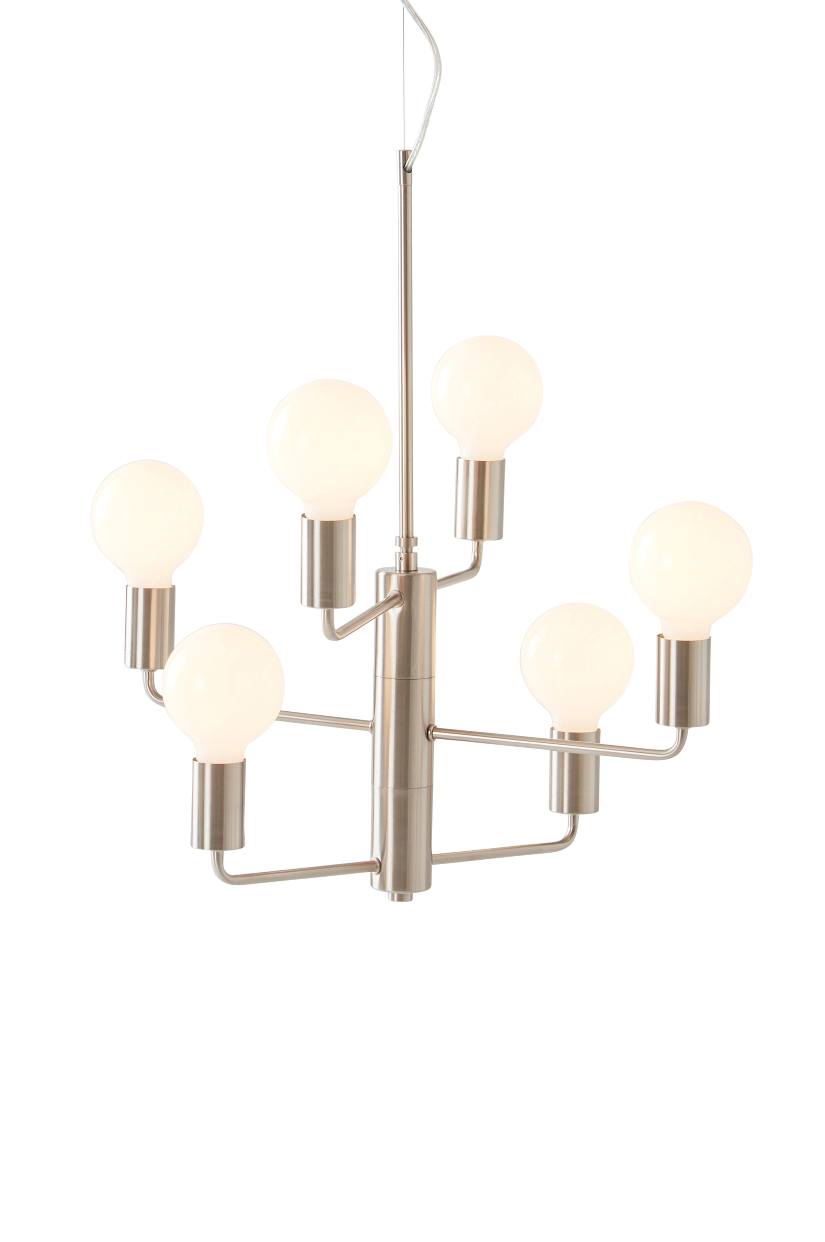 Metallinen kattovalaisin, jossa kuusi valopistettä ja ripustusvaijeri. Moderni ja pelkistetty kattovalaisin. Valaisimessa on kuusi haaraa, joiden valonlähteet antavat kauniin valon huoneeseen. Johdon pituus 70 cm. Valonlähteet eivät sisälly toimitukseen. Kattopistoke ei sisälly toimitukseen uusien EU-sääntöjen vuoksi. Se on ostettavissa erikseen ja on nimeltään ROOF EARTH -kattopistoke.
