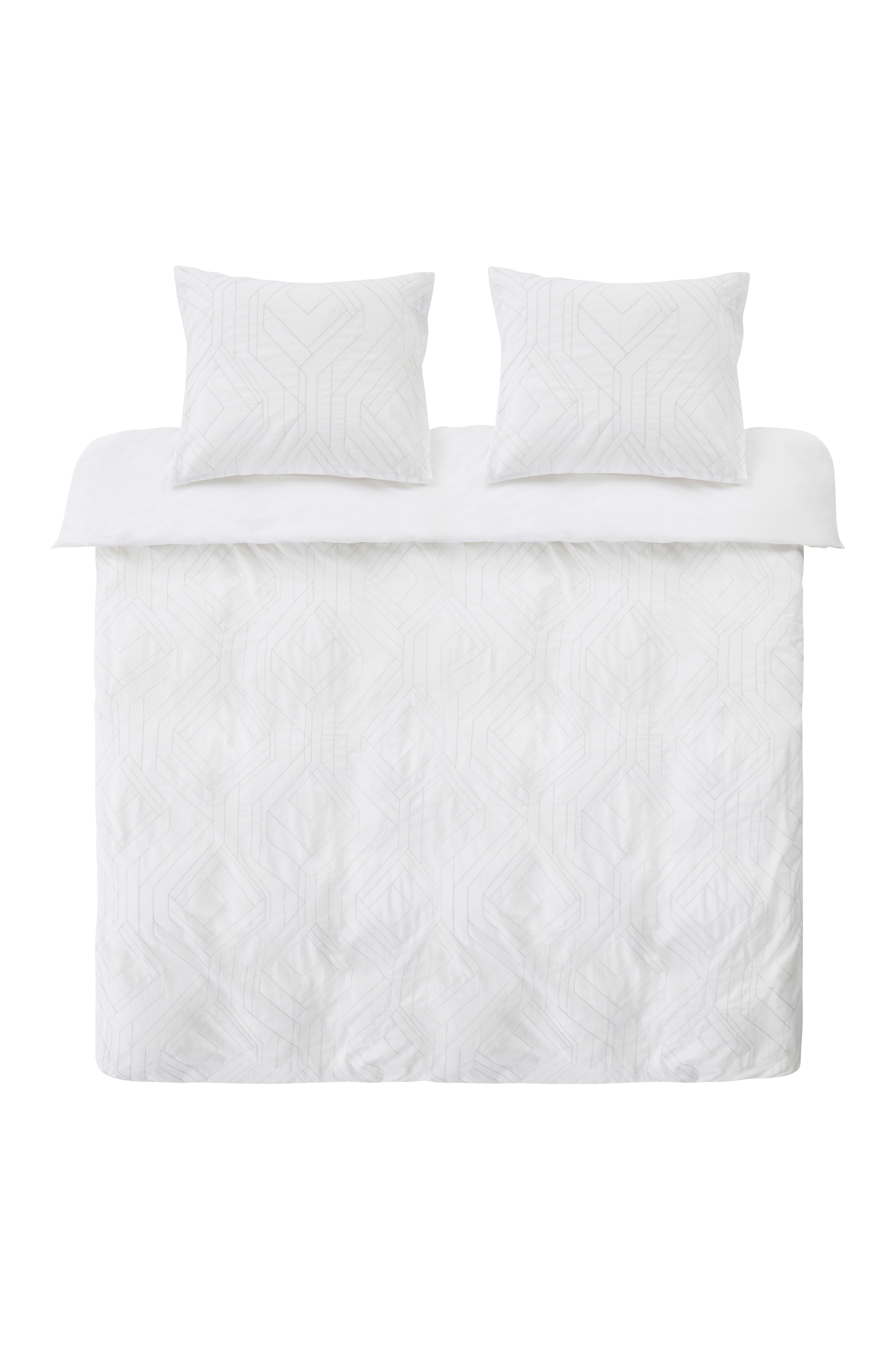 3-osainen pussilakanasetti miellyttävää puuvillaa. Sekä pussilakanassa että tyynyliinassa on ohuella, lähes saman sävyisellä langalla kirjailtu kuvio, joka erottuu kauniin hillitysti. Taustapuoli on yksivärinen ja samaa kangasta kuin etupuoli. Puuvilla on miellyttävä vuodevaatteiden materiaali, sillä se tuntuu viileältä ja pehmeältä ihoa vasten. Pussilakanan yläkulmissa on aukot, jotka helpottavat pussilakanan vetämistä peiton päälle. Vetoketjusuljenta. Langantiheys 144 tc. (Langantiheys kertoo lankojen lukumäärän, thread counts, neliötuuman alalla. Mitä suurempi langantiheys, sitä laadukkaampi kangas).
