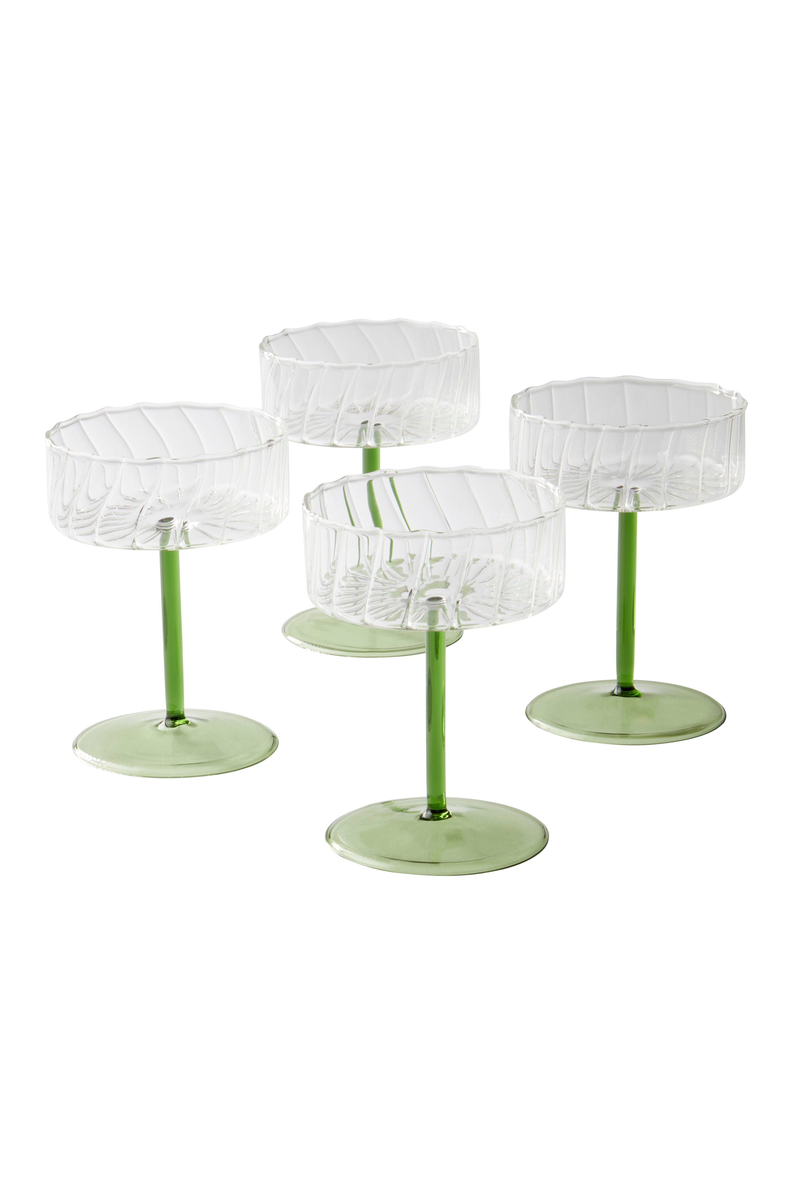 Neljä raikasta ja tyylikästä cocktaillasia, jotka sopivat hyvin kevään drinkeille. Cocktaillaseissa on kapea jalka ja kirkas pesä, jossa on viistoraitainen kohokuvio.