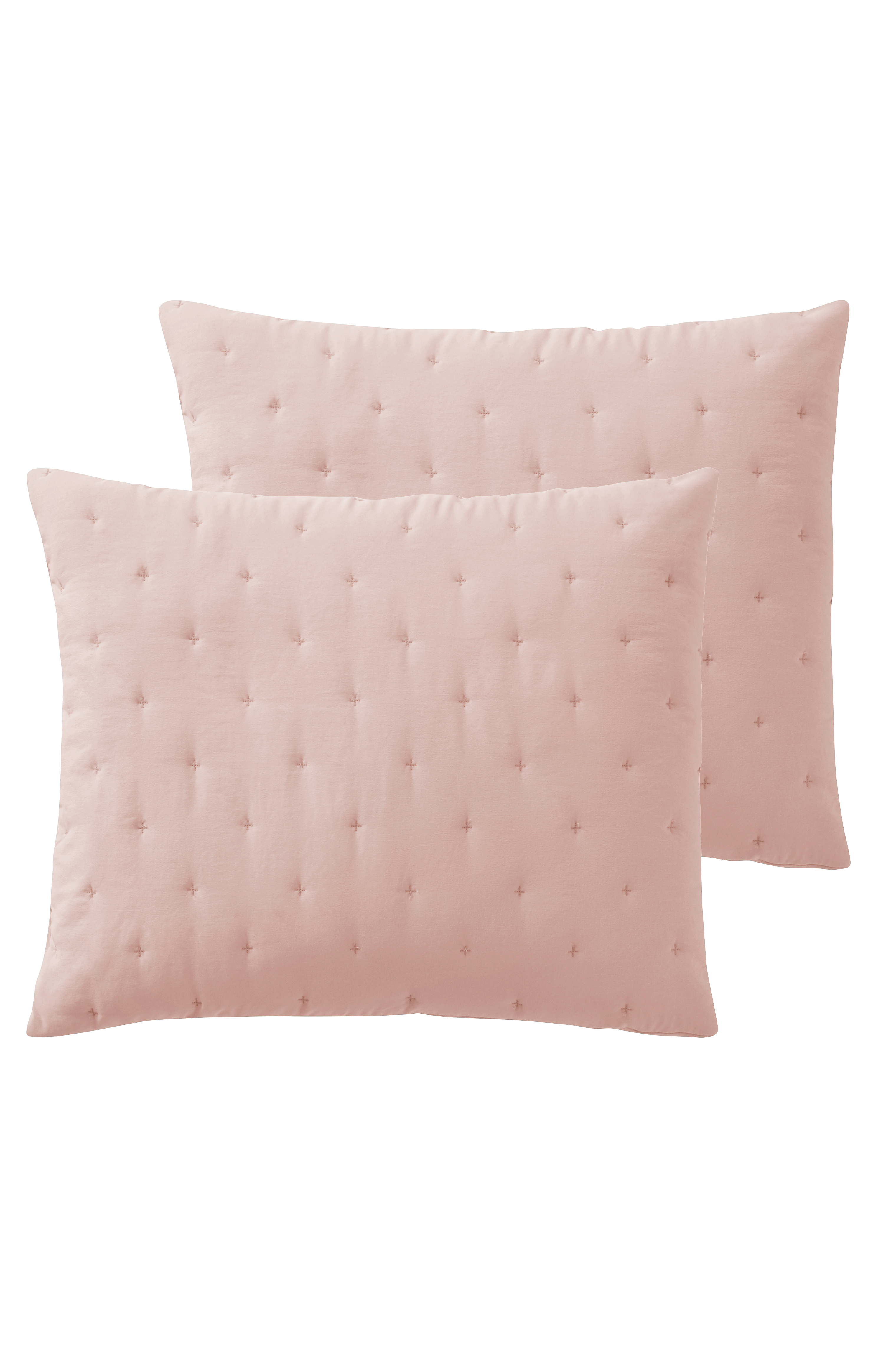 Tyynynpäälliset pehmeää, miellyttävän tuntuiseksi pestyä polyesteriä. 2/pakk. Pienet kirjaillut ristit muodostavat hillityn tikatun kuvion etupuolelle. Tikkaus pitää kankaan kevyen toppauksen paikallaan. Sileä taustapuoli. Piilovetoketju takana.
