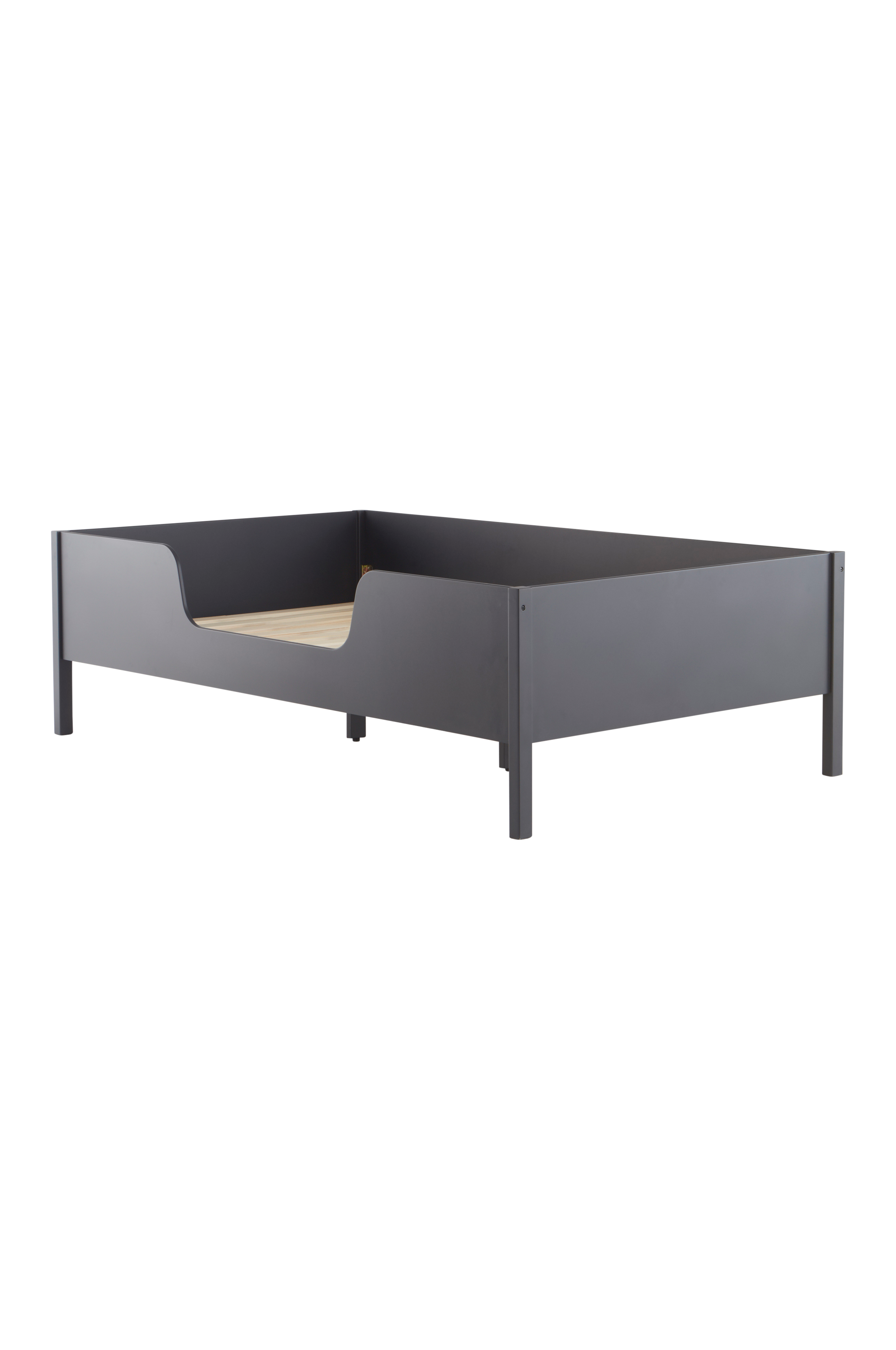 Sängyssä on mukava runko, jonka ympärillä on korkea reuna. Toisella pitkällä sivulla on madallettu reuna, jotta pienet lapset voivat kiivetä sisään ja ulos itse.