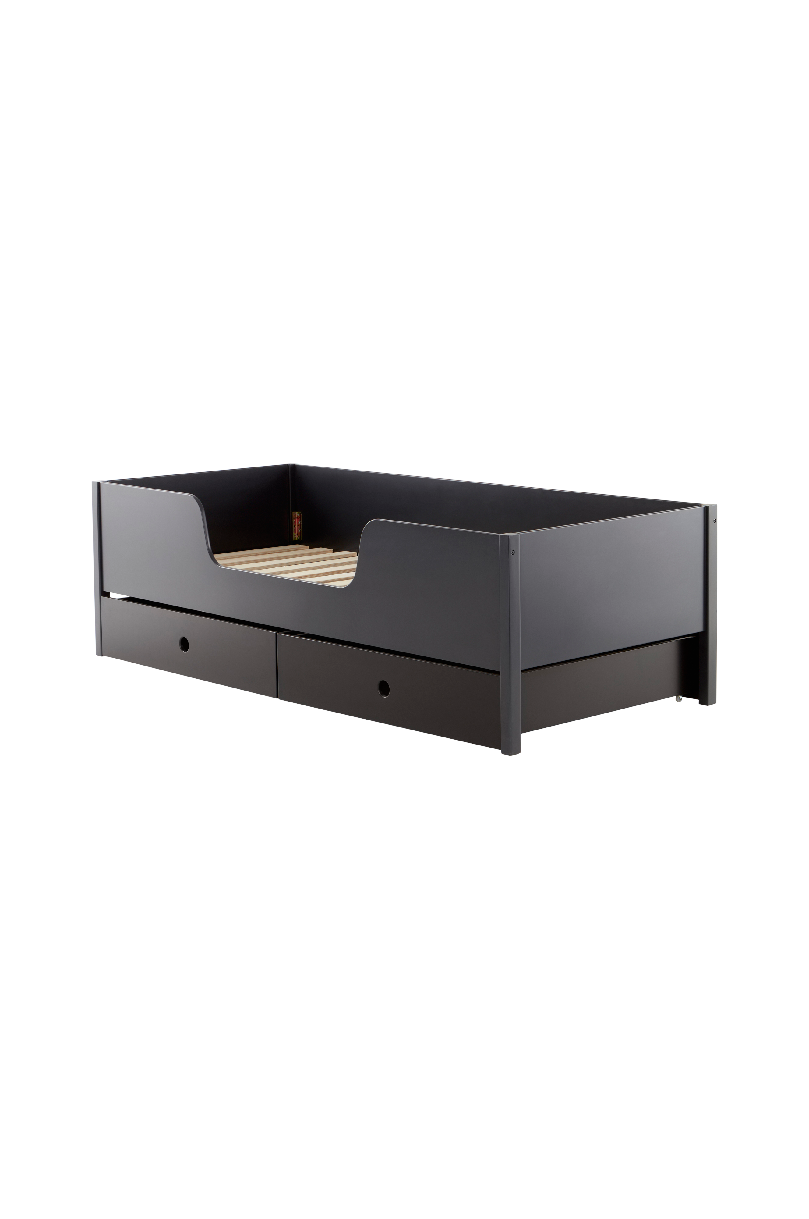 Sängyssä on mukava runko, jonka ympärillä on korkea reuna. Toisella pitkällä sivulla on madallettu reuna, jotta pienet lapset voivat kiivetä sisään ja ulos itse. Sängyn alla on kaksi tilavaa säilytyslaatikkoa, joissa on pyörät alla. Laatikot on helppo vetää ulos kahvoina toimivista aukoista. Kätevä säilyttää esimerkiksi leluja, vaatteita ja paljon muuta. Laatikot ovat irralliset, ja sänkyä voi käyttää yhtä hyvin ilman niitä.