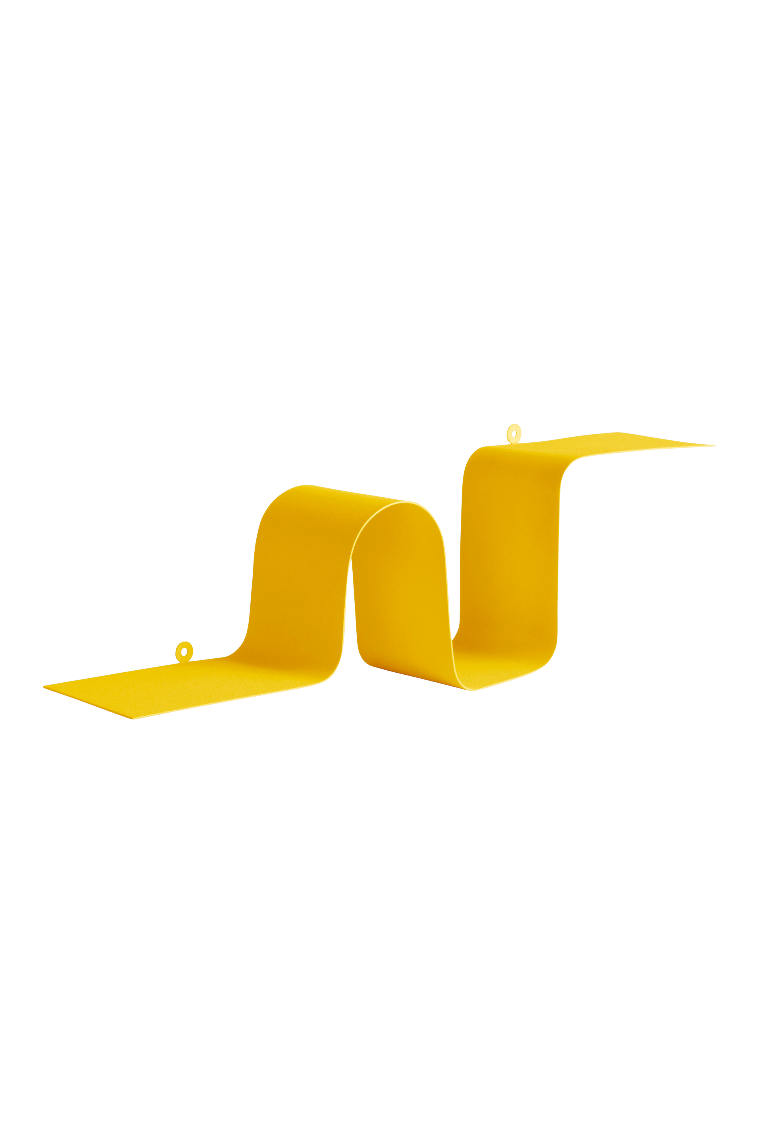 Metallinen seinähylly, jossa yksilöllinen ja leikkisä muotoilu. Tyylikäs ja kätevä malli, jossa aukot ripustusta varten. Pintakäsittely vaihtelee hyllyn värin mukaan. Mustassa on mattapinta, liilassa ja vihreässä karhea pinta ja metallinhohtoisessa harjattu pinta.