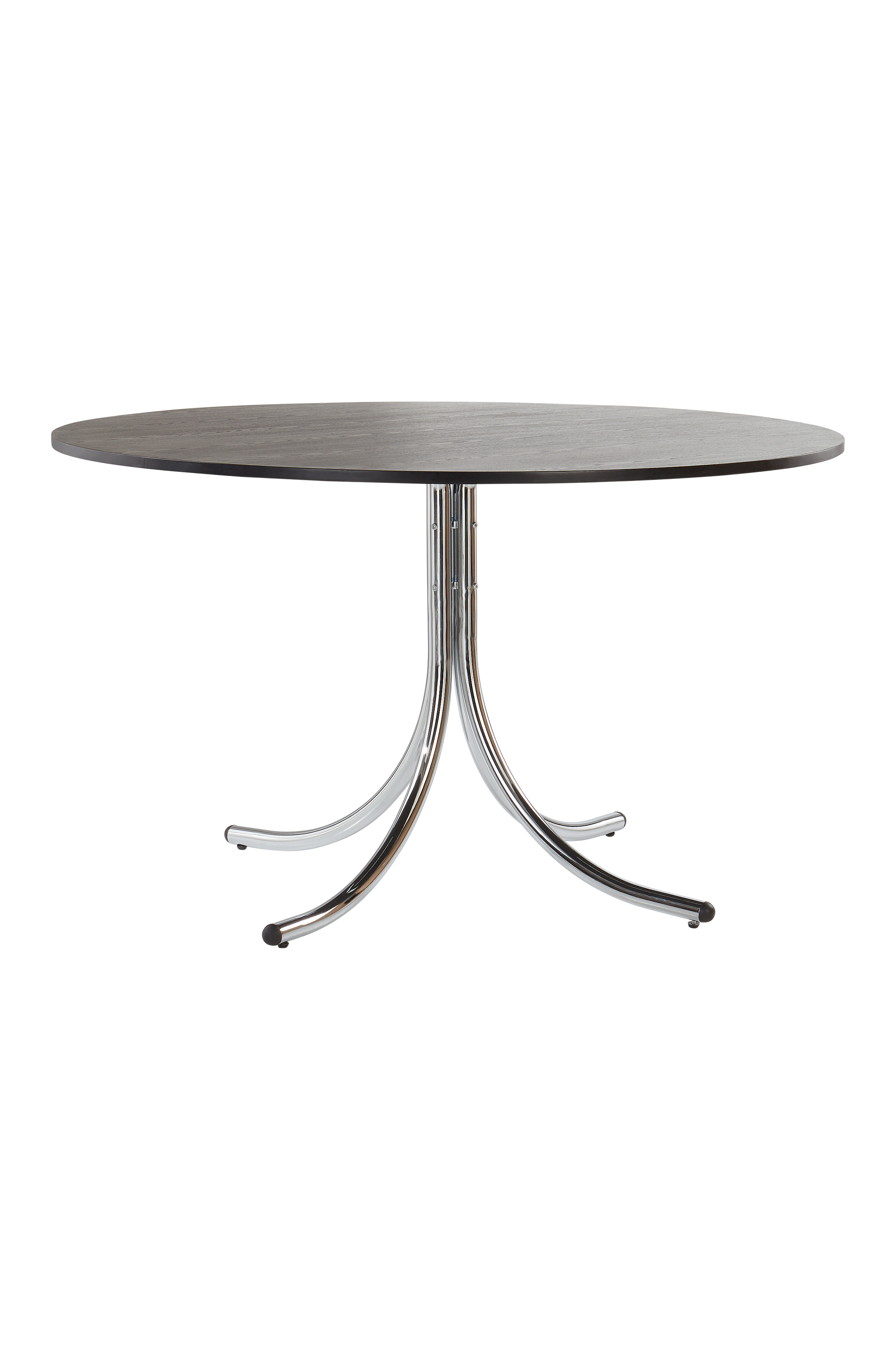 Pyöreä ruokapöytä, jonka jalusta on valmistettu kiiltävästä kromatusta rautaputkesta ja pöytälevy FSC-sertifioidusta MDF-levystä erilaisin pintavaihtoehdoin: pähkinäviilu, valkolakattu pinta tai vesipohjaisella maalilla mustaksi maalattu saarniviilu. Tyylikäs ruokapöytä huokuu viehättävää 1970-luvun retrohenkeä. Pyöreän pöydän ääressä kaikki ruokailijat voivat seurustella kasvokkain toistensa kanssa. Osittain koottava. Kokoamisohje mukana.