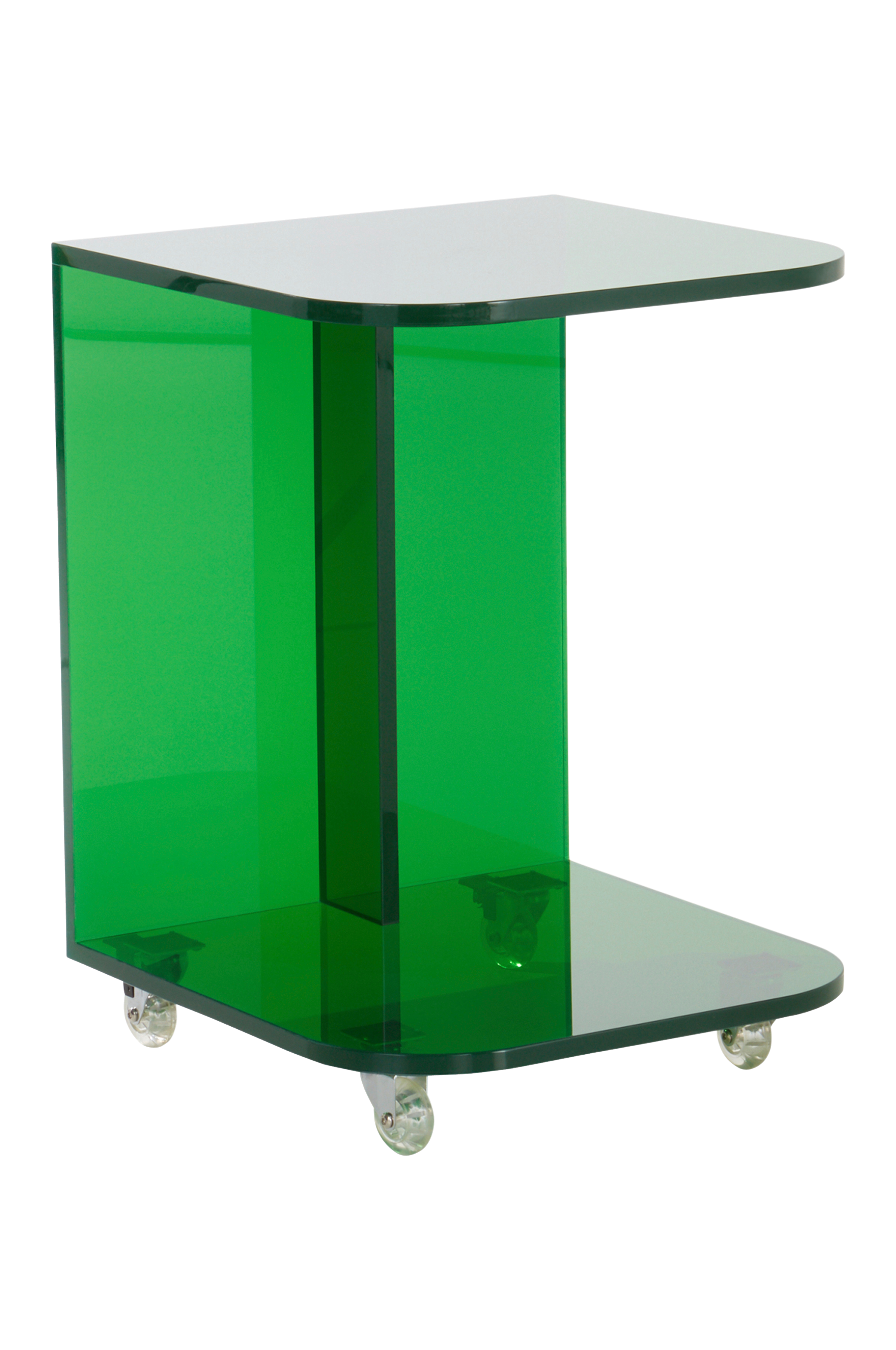 Sivupöytä akryylilasia. Pelkistetyn muotoinen sivupöytä, jossa futuristinen ilme. Pyöristetyt etureunat ja alhaalla säilytyshylly esimerkiksi lehdille ja kirjoille. Pienet pyörät helpottavat pöydän siirtämistä. CLYDE on monikäyttöinen ja sopii sivupöydäksi sohvan viereen tai vaikka yöpöydäksi. Virkistävät värivaihtoehdot.