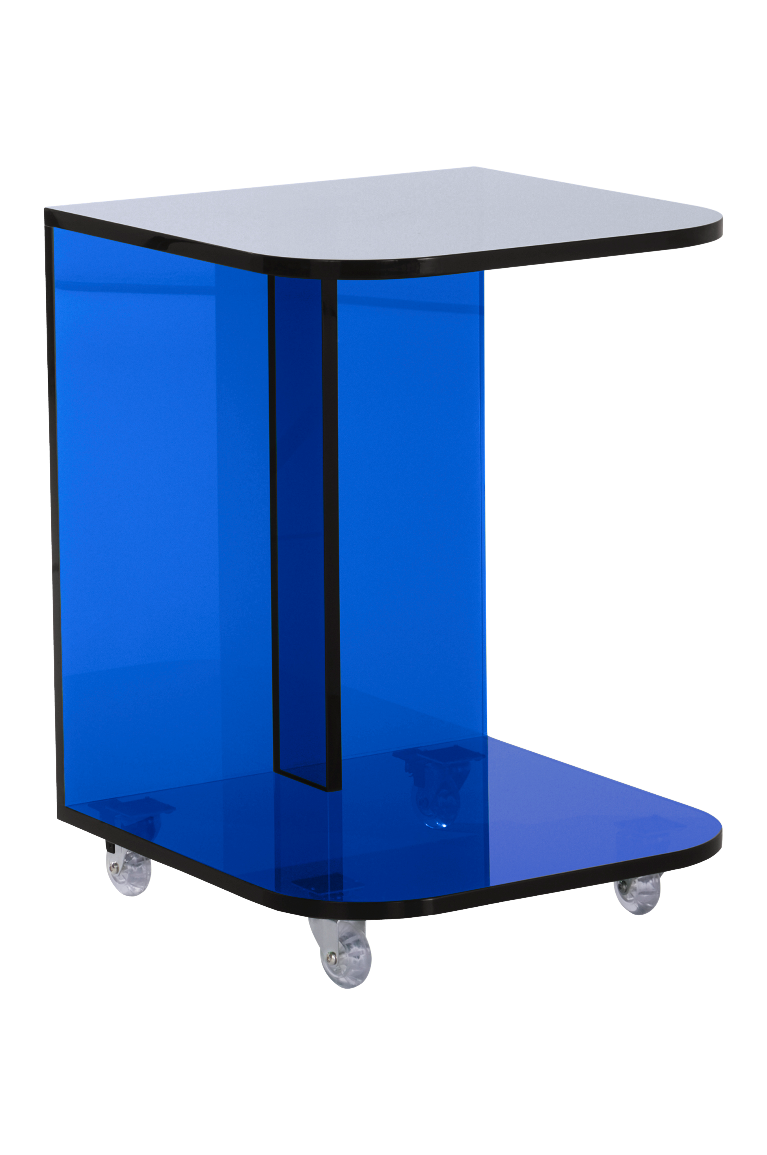 Sivupöytä akryylilasia. Pelkistetyn muotoinen sivupöytä, jossa futuristinen ilme. Pyöristetyt etureunat ja alhaalla säilytyshylly esimerkiksi lehdille ja kirjoille. Pienet pyörät helpottavat pöydän siirtämistä. CLYDE on monikäyttöinen ja sopii sivupöydäksi sohvan viereen tai vaikka yöpöydäksi. Virkistävät värivaihtoehdot.