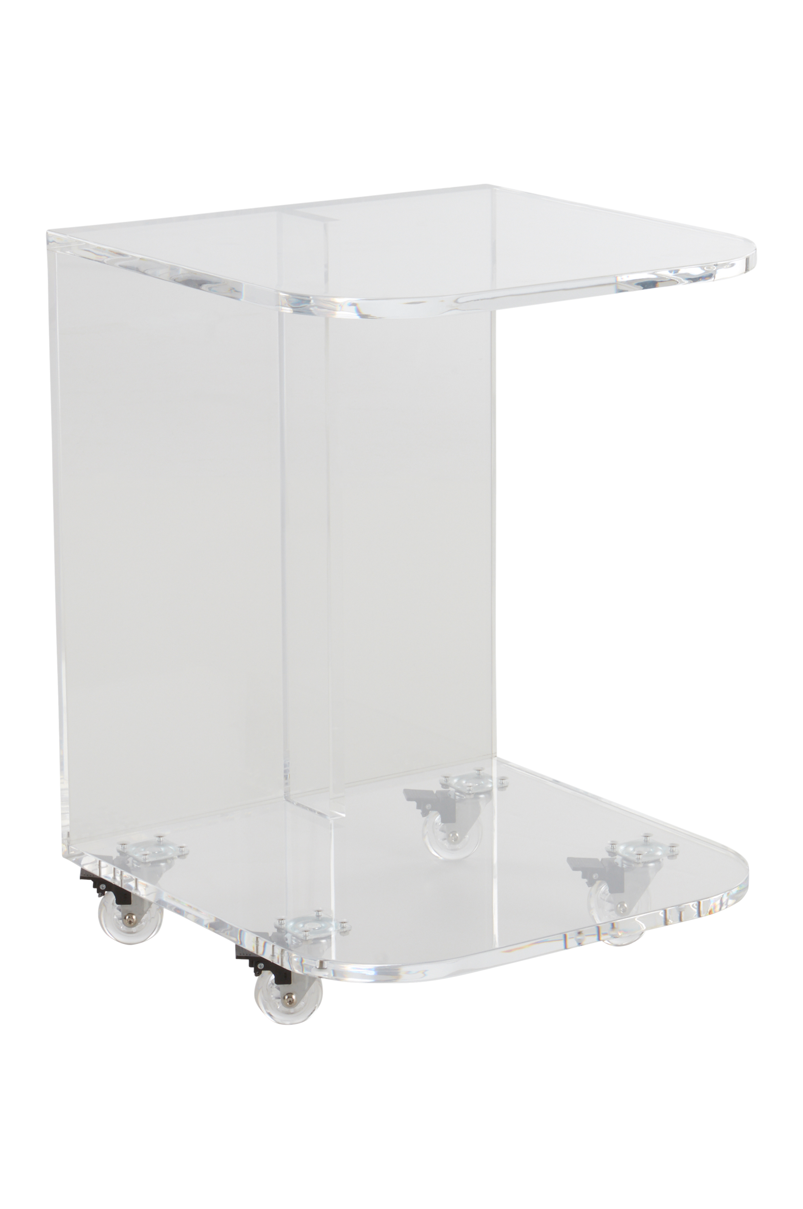 Sivupöytä akryylilasia. Pelkistetyn muotoinen sivupöytä, jossa futuristinen ilme. Pyöristetyt etureunat ja alhaalla säilytyshylly esimerkiksi lehdille ja kirjoille. Pienet pyörät helpottavat pöydän siirtämistä. CLYDE on monikäyttöinen ja sopii sivupöydäksi sohvan viereen tai vaikka yöpöydäksi. Virkistävät värivaihtoehdot.