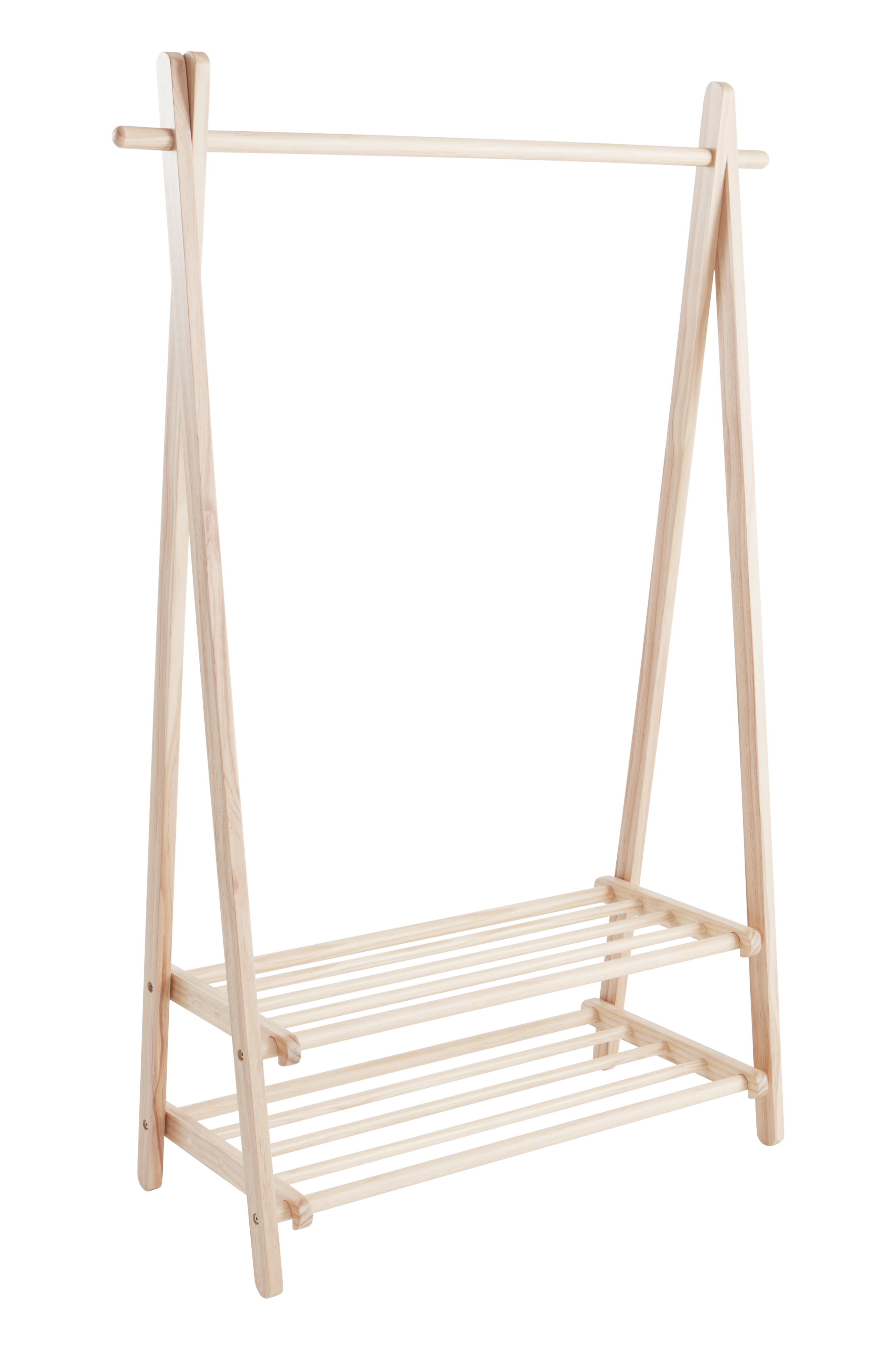 COLE-vaateteline on FSC-merkittyä mäntyä, jonka pinta on käsitelty saippualla. COLE on vapaasti seisova. Siinä on vaatetanko vaateripustimille sekä kaksi kenkähyllyä. Vaateteline on kätevä monissa huoneissa. Se on tyylikäs säilytyskaluste sekä makuuhuoneeseen että vaatehuoneeseen. Kenkähyllyt voidaan taittaa ylös, jolloin telinettä on helppo säilyttää. Alas taitetut kenkähyllyt lukittuvat paikoilleen ja pitävät vaatetelineen tukevasti pystyssä. Osittain koottava. Kokoamisohje mukana. Tilaa vaateripustimet erikseen.