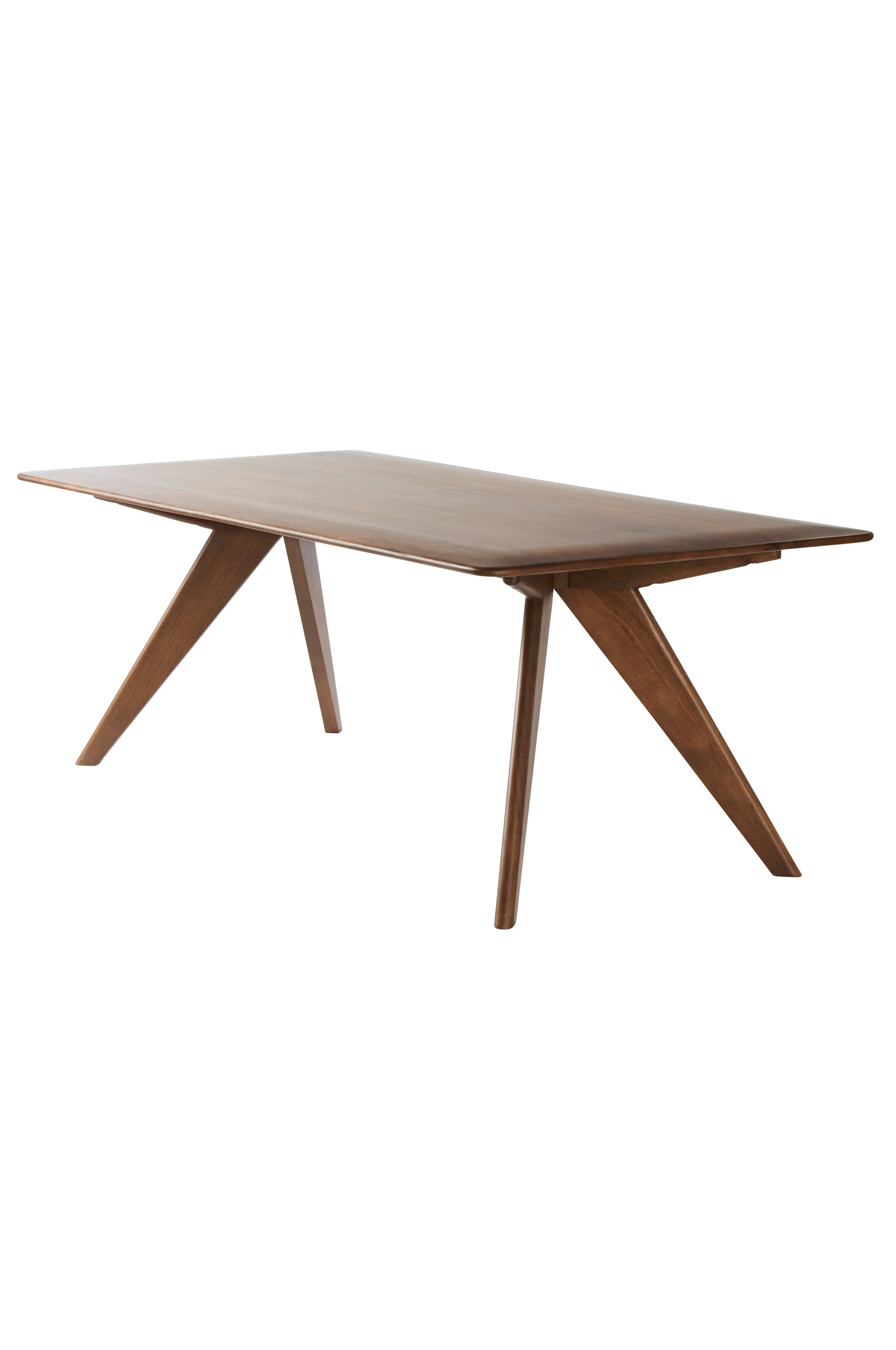 Suorakaiteen muotoinen ruokapöytä massiivista mangopuuta. Sileässä pöytälevyssä on pyöristetyt kulmat ja kevyesti kaareutuvat, 60-lukuhenkiset reunat. Tyylikkäästi muotoillut jalat vahvistavat retrohenkistä ilmettä, ja jalkojen käytännöllinen sijoittelu antaa reilusti istumatilaa pöydän ympärille.