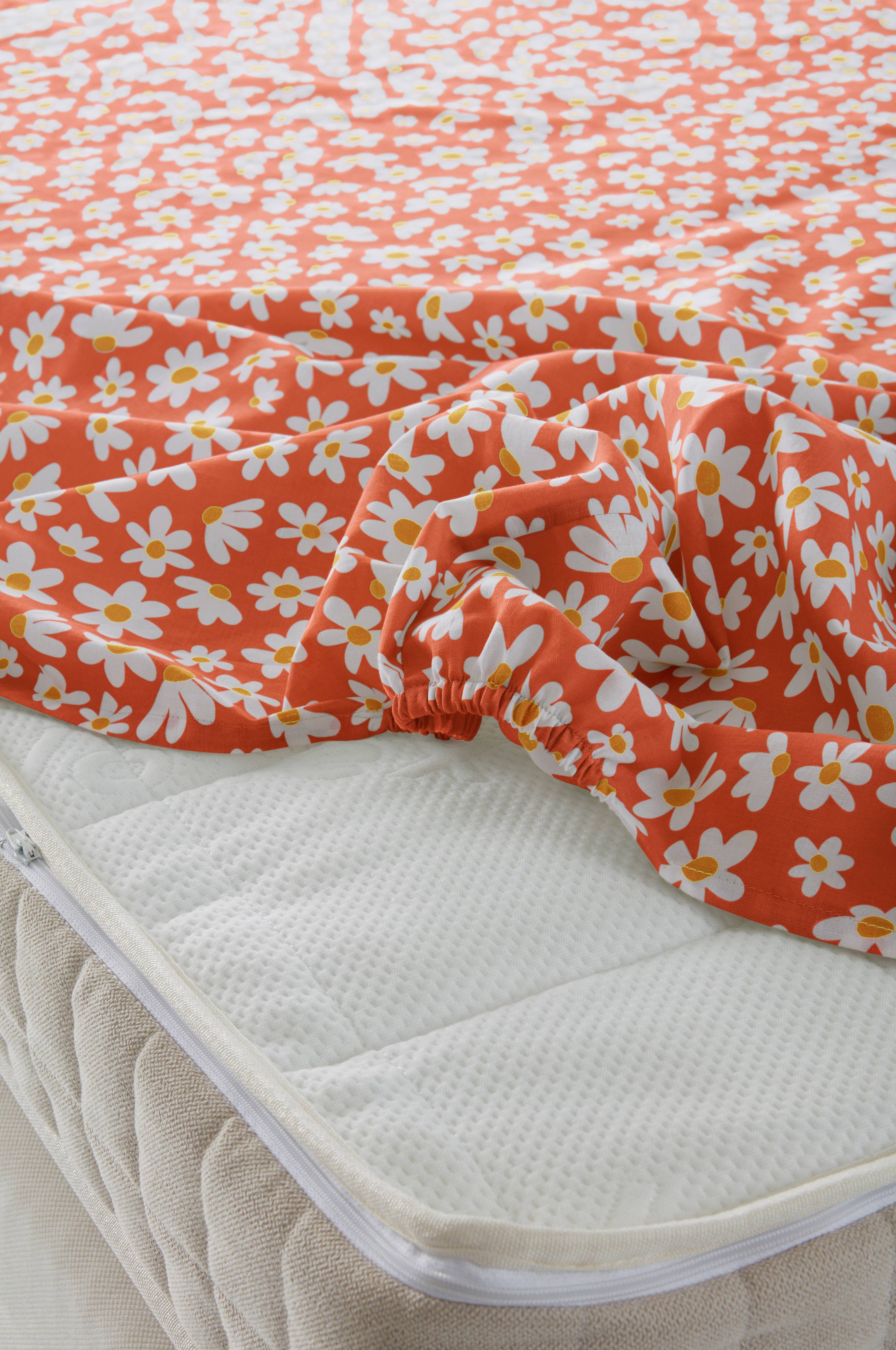 Pikkukukallinen kuminauhalakana ekologista puuvillaa. Kulmissa olevien kuminauhojen ansiosta sijaaminen on helppoa ja lakana pysyy paikallaan. Kankaassa on miellyttävä painatus, ja puuvilla tuntuu viileältä ja mukavalta ihoa vasten. Fantasiakukat tuovat mieleen pienet valkoiset tuhatkaunot. Lämmin ja miellyttävä pohjaväri. Langantiheys 144 tc. (Langantiheys kertoo lankojen lukumäärän, thread counts, neliötuuman alalla. Mitä suurempi langantiheys, sitä laadukkaampi kangas.)