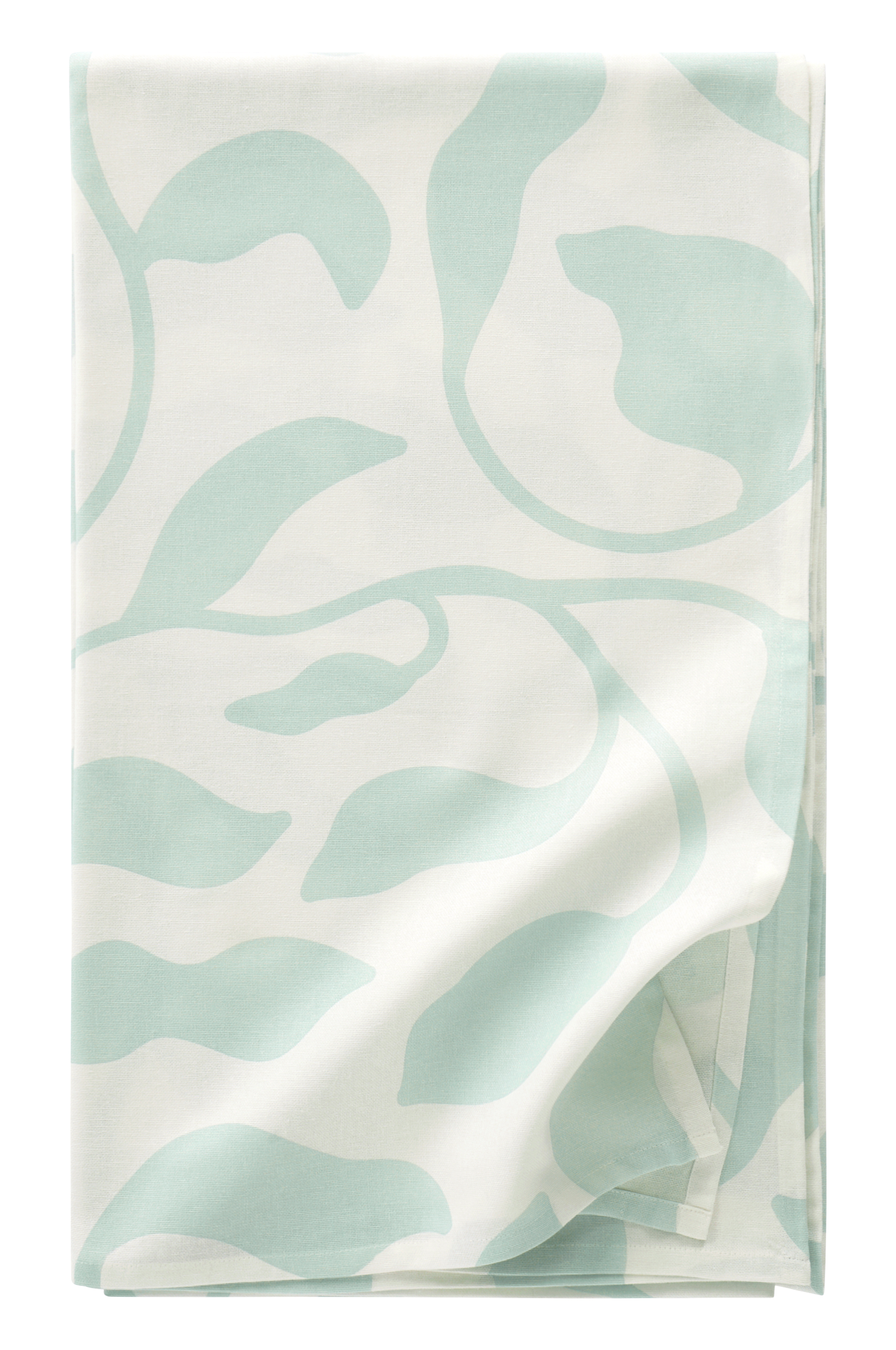 Pöytäliina puuvillaista puolipanamaa. DELLA-sarjan tuotteissa on viehättävä kesäisen värinen lehtikuvio, joka on painettu valkoiselle pohjalle. Kankaan paino 170 g/m².