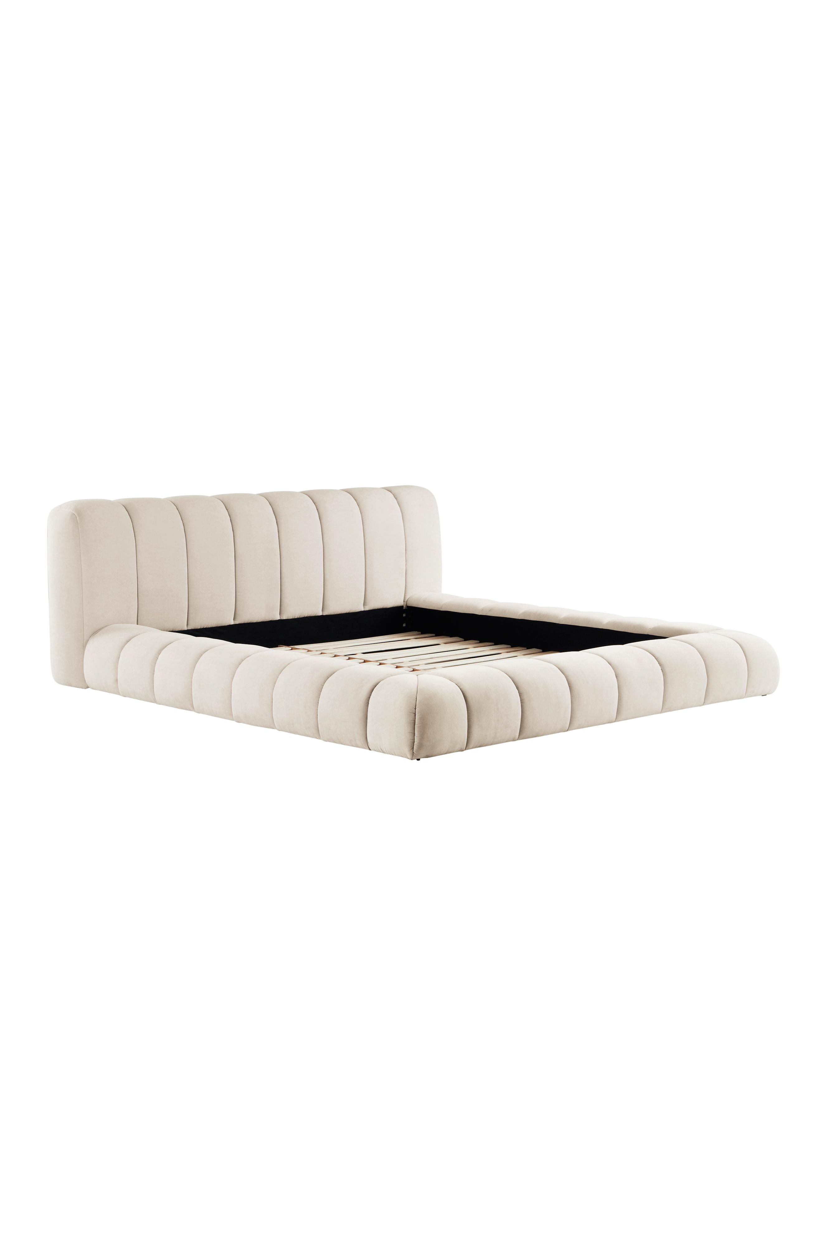 Pehmeä, pyöreämuotoinen, muhkea ja houkutteleva sängynrunko. Sängynpääty ja runko ympäriinsä on topattu pehmeiksi ja päällystetty neutraalilla ja helposti yhdisteltävällä yksivärisellä polyesterikankaalla. Pystysuorat saumat tekevät sängystä erittäin tyylikkään. Sängyn ympärillä oleva runko ulottuu lähes lattiaan asti, vain pieni ilmarako on jätetty, jotta ilma pääsee kiertämään sängyn alla. Runko FSC-sertifioitua mäntyä ja vaneria. Sängynrungossa on mäntyinen sälepohja, ja voit täydentää rungon mieleisilläsi patjoilla tai joustinpatjoilla. Patja/joustinpatja ei mukana.