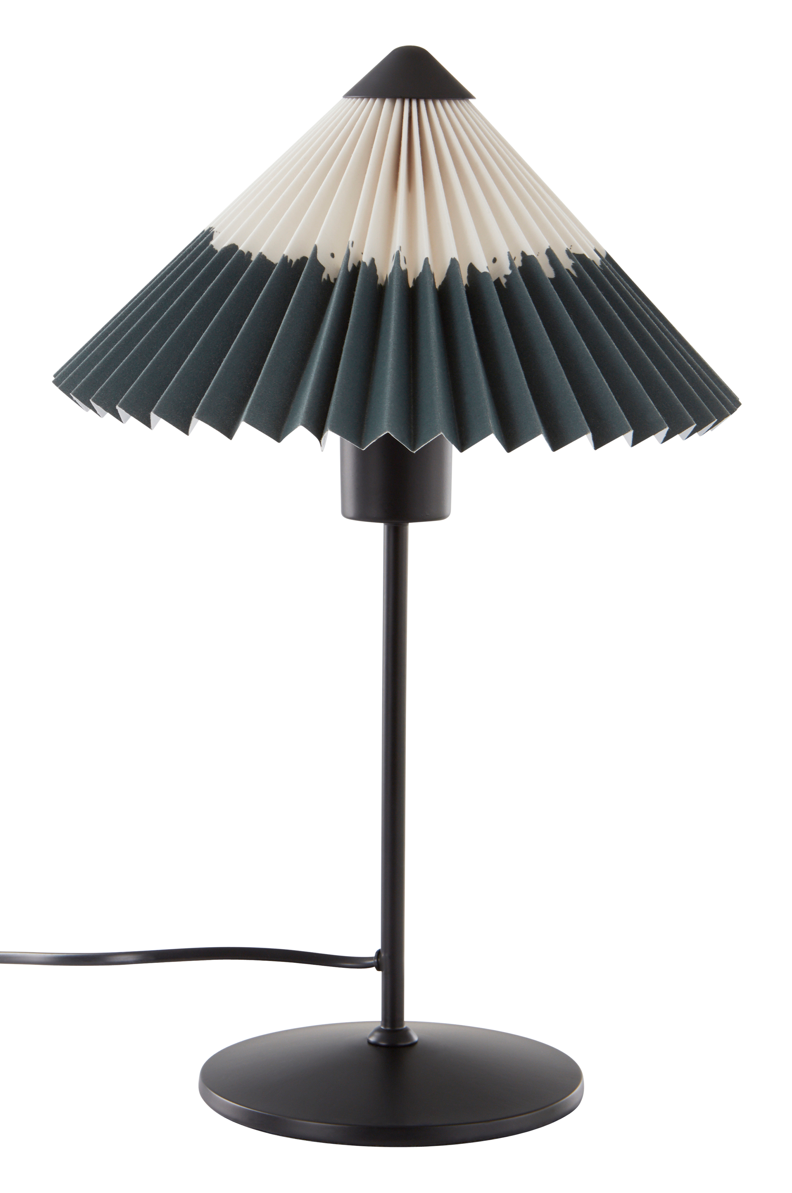 Pöytävalaisin, jossa kankainen laskosvarjostin ja maalattu metallijalka. Lampunvarjostimessa on tyylikkäät värit ja aavistus batikkihenkeä. Musta muovijohto, jossa virtakytkin.