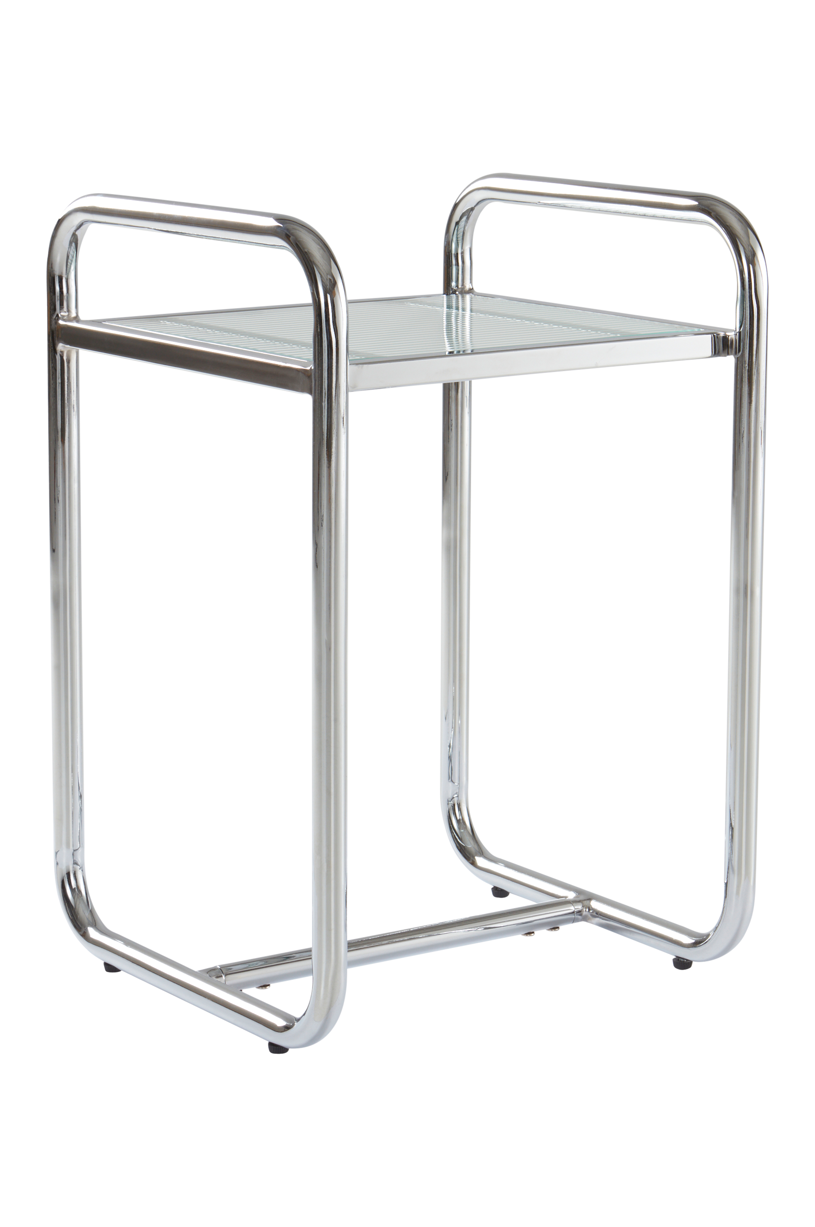 Nelikulmainen DOMINGO-sivupöytä, jossa pöytälevy uurrettua lasia. Runko teräsputkea, joka on joko jauhemaalattu tai viimeistelty krominväriseksi. Ihana 80-lukuhenkinen pöytä, joka tuntuu samalla uskomattoman uudelta.