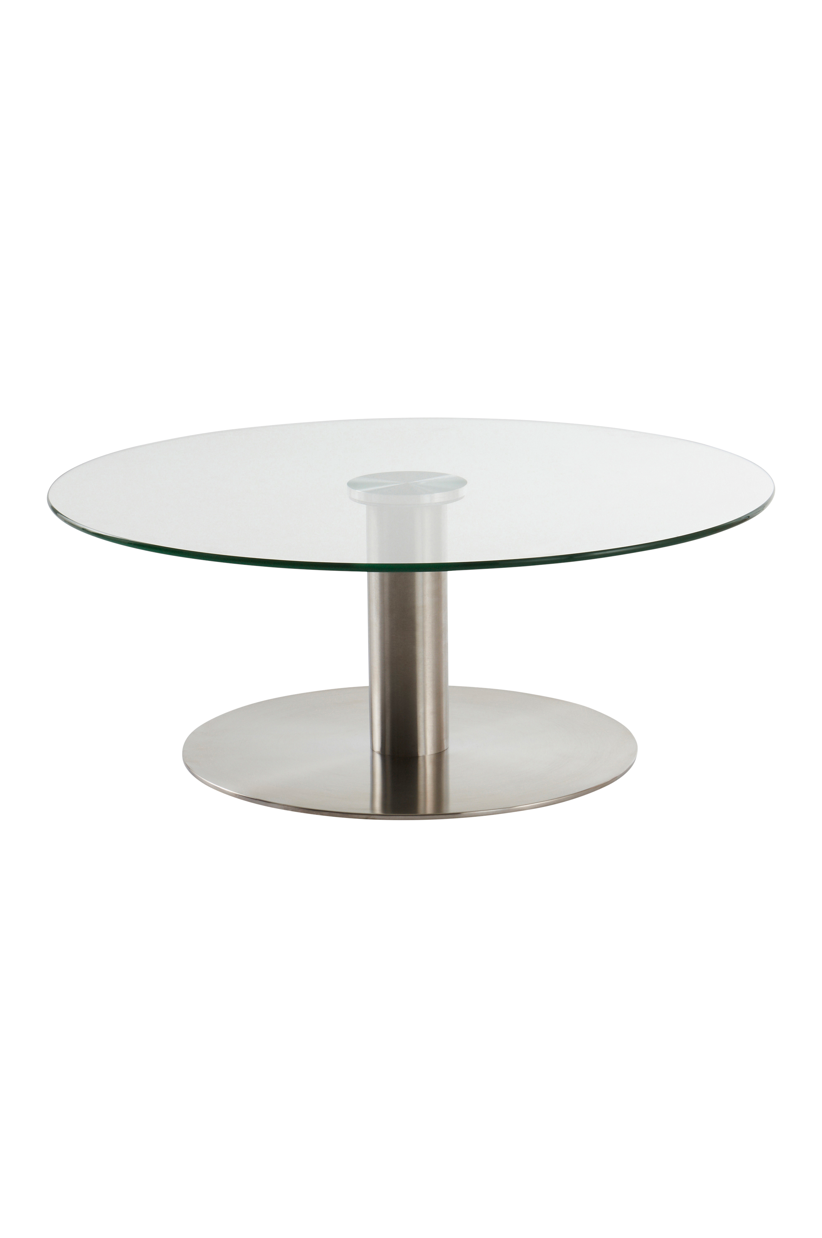 Pyöreä sohvapöytä, jossa lasilevy. Pilarijalka ruostumatonta terästä, jossa harjattu pinta. Suora jalka on tyylikäs ja harmonisoituu hienosti lasiseen pöytälevyyn jalan näkyessä lasin läpi luoden tyylikkään keskipisteen. Matala pöytä luo miellyttävää loungehenkeä sohvan ympärille. Osittain koottava. Kokoamisohje mukana.
