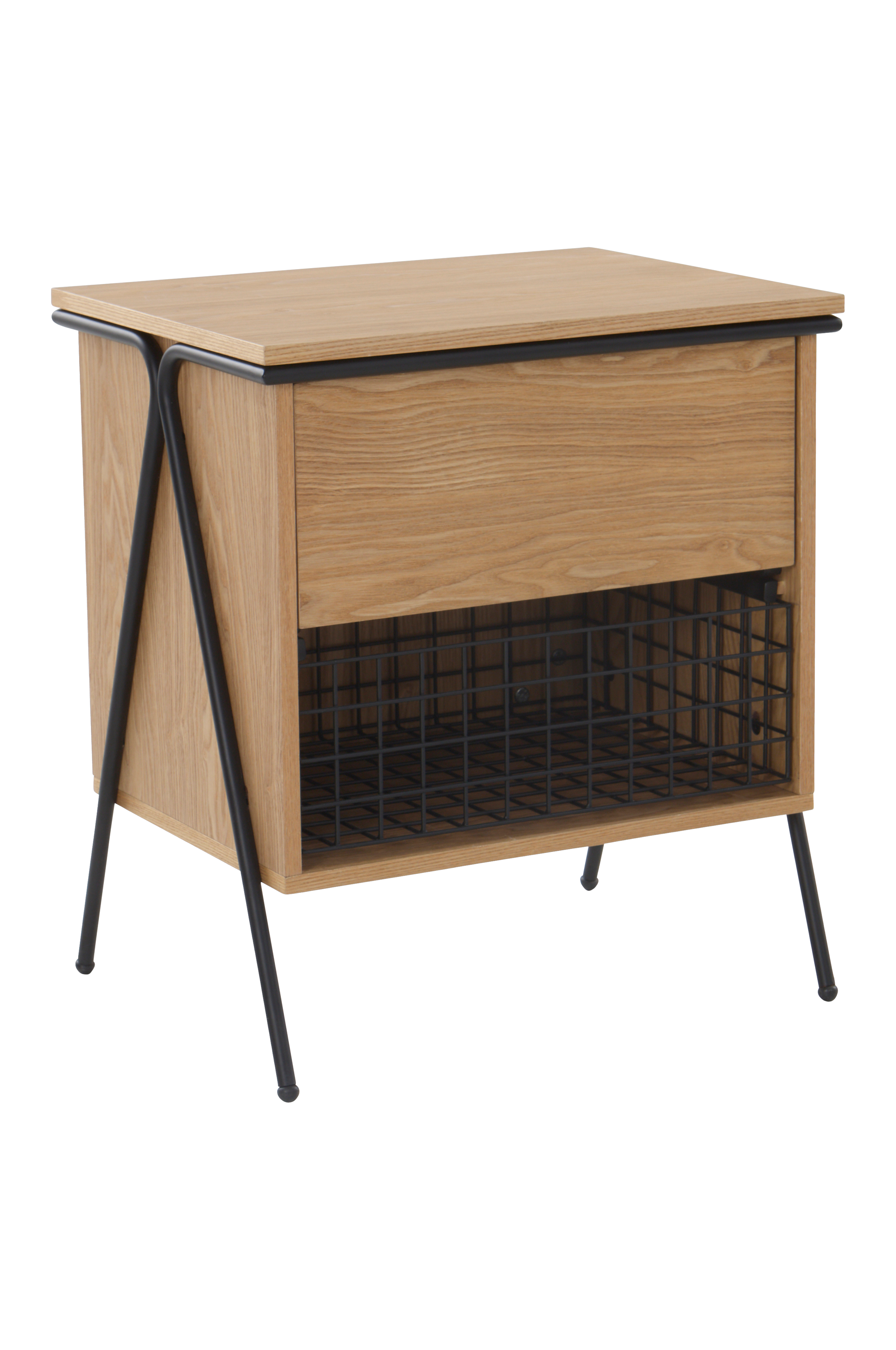 DUDLEY-yöpöydässä on laatikko ja lankakori suoraa säilytystä varten. Sen muotoilussa yhdistyvät käytännöllisyys ja moderni tyyli.