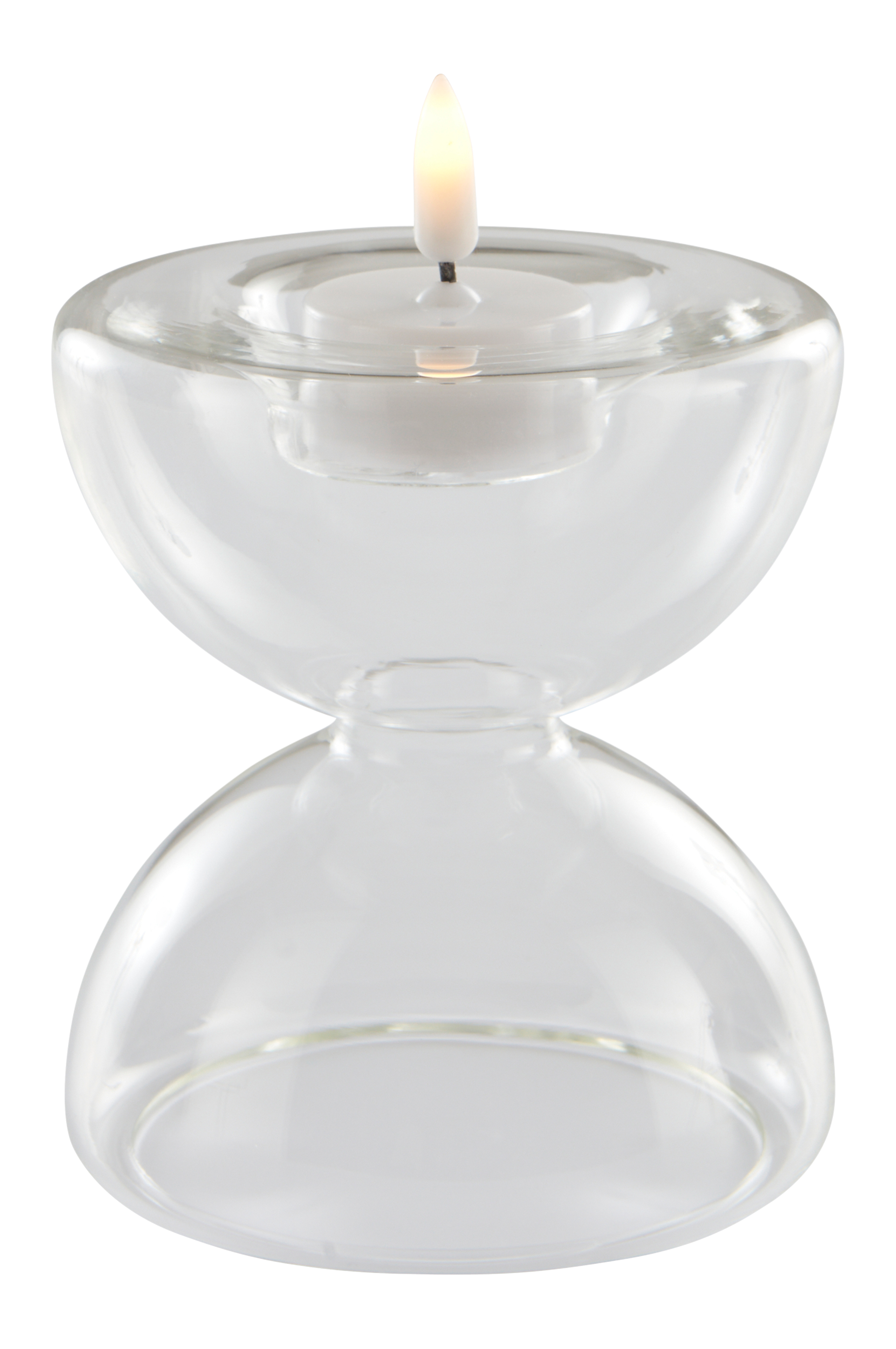 ECHO on käsintehty lasinen kynttilänjalka, jonka pehmeä muotoilu muistuttaa tiimalasia. Kynttilänjalka sopii lämpökynttilälle.