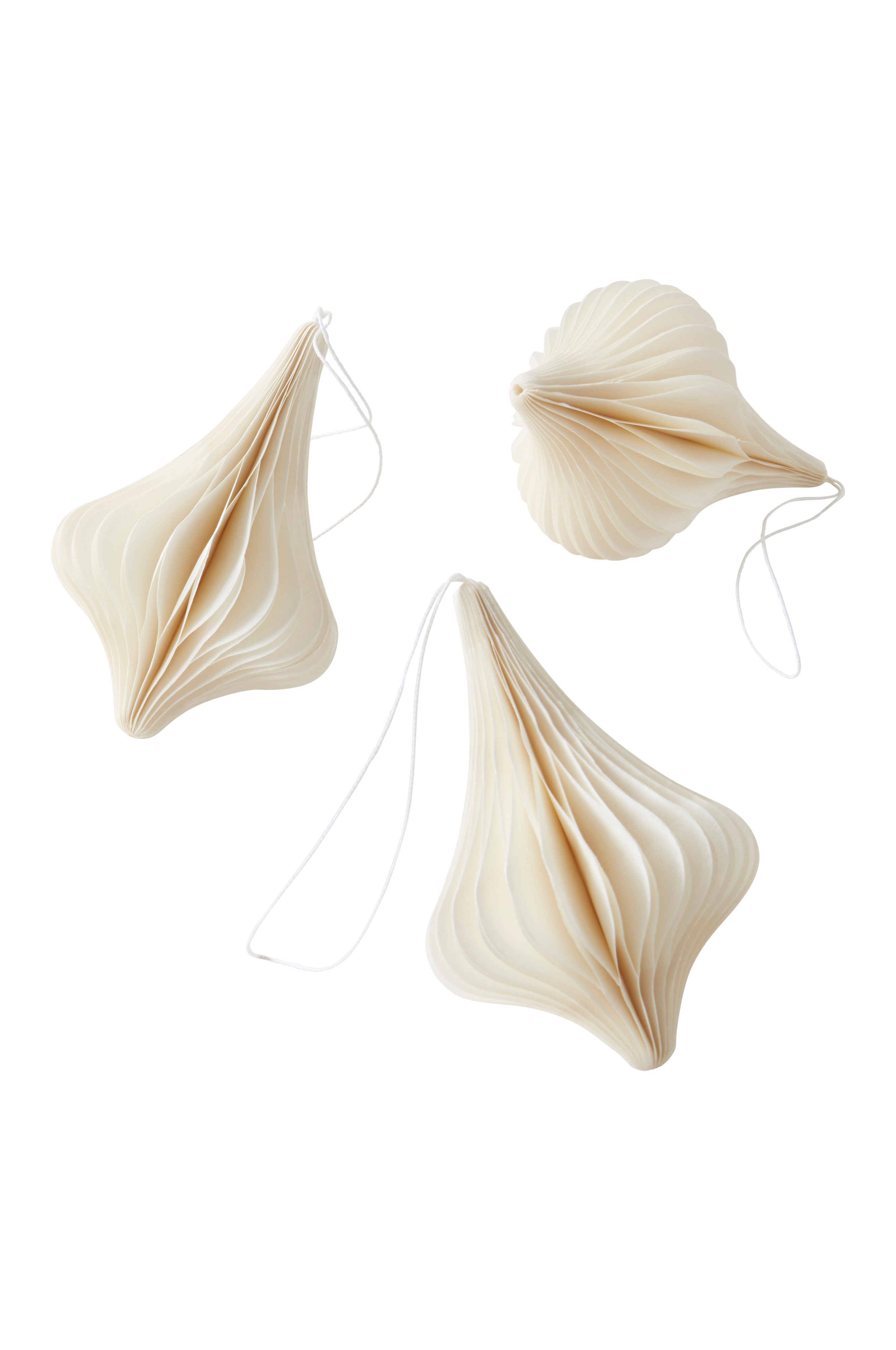 Käsintehdyt paperikoristeet, 3 kpl. Jokaisessa koristeessa on lenkki, josta sen voi ripustaa ikkunaan, joulukuuseen tai mihin vain. Jokainen käsityönä tehty koriste on yksilöllinen. Koristeet toimitetaan paperirasiassa.