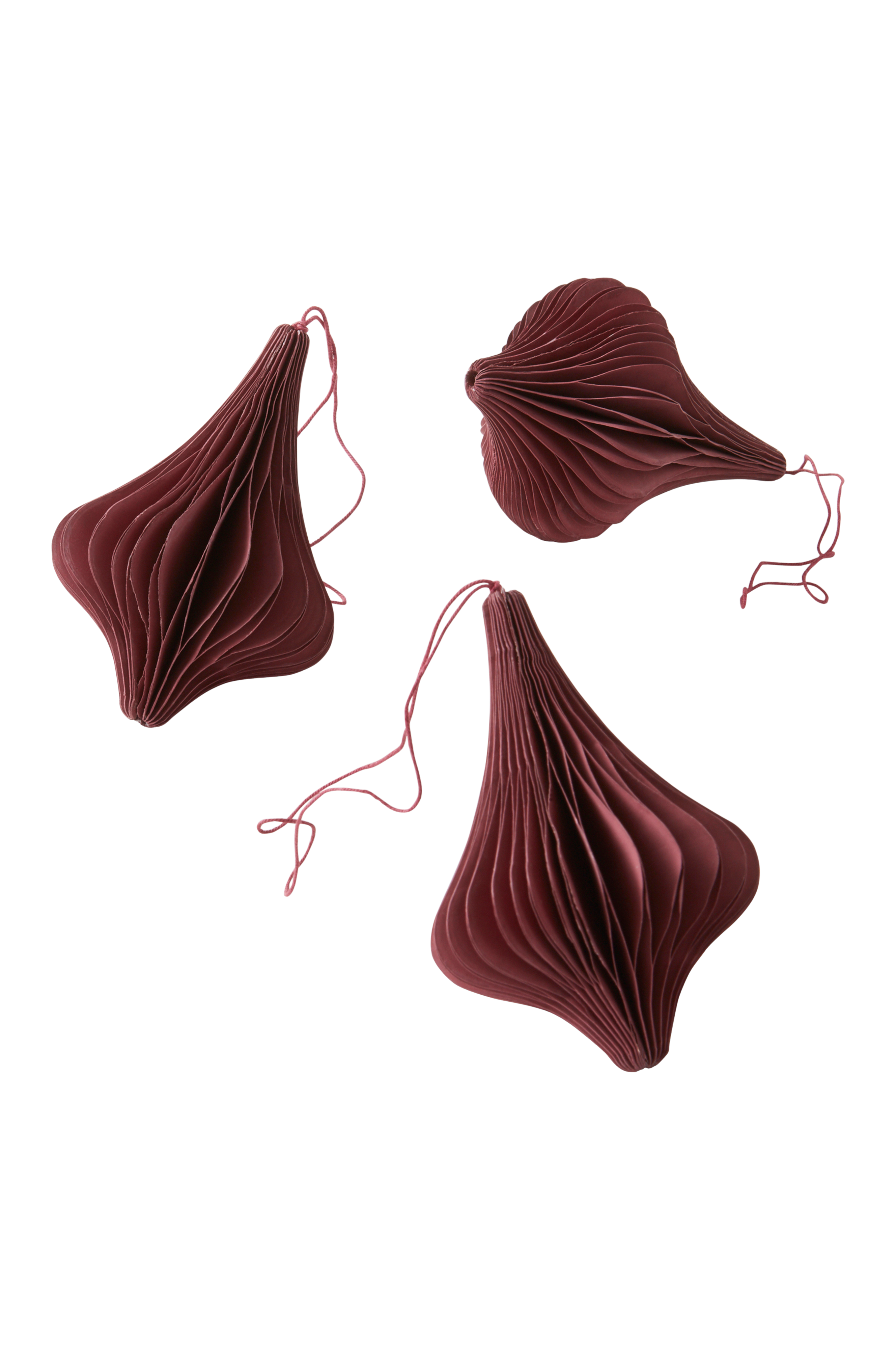 Käsintehdyt paperikoristeet, 3 kpl. Jokaisessa koristeessa on lenkki, josta sen voi ripustaa ikkunaan, joulukuuseen tai mihin vain. Jokainen käsityönä tehty koriste on yksilöllinen. Koristeet toimitetaan paperirasiassa.