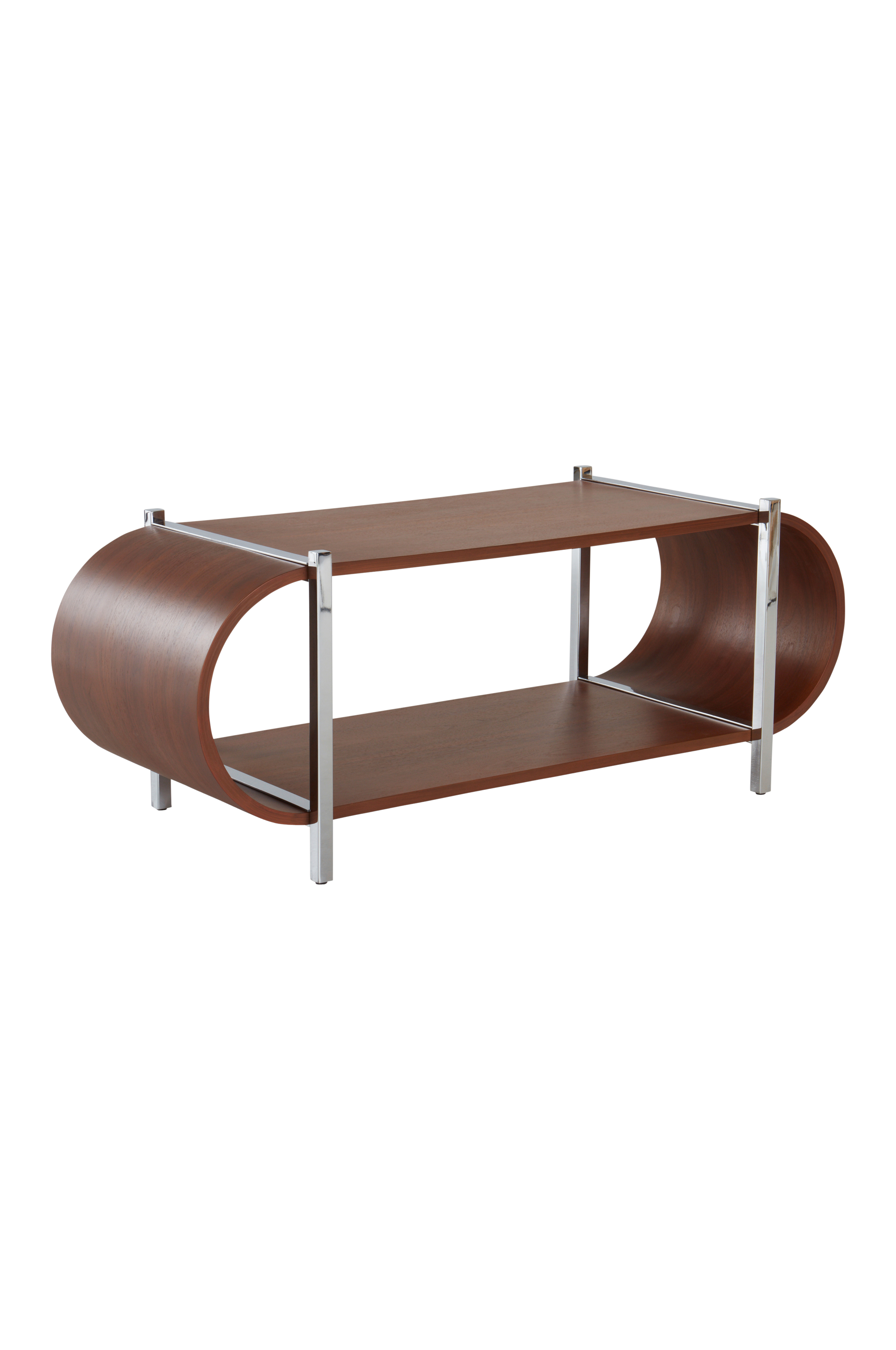 Sohvapöytä, joka on sivuprofiililtaan tyylikkään soikea. Pöytä on valmistettu muotoonprässätystä pähkinäviiluvanerista, jossa on vesipohjainen pintakäsittely. Kiiltävät kromatut rautajalat ovat profiililtaan nelikulmaiset. Pöytä huokuu viehättävää 70-luvun tunnelmaa. Osittain koottava. Kokoamisohje mukana.