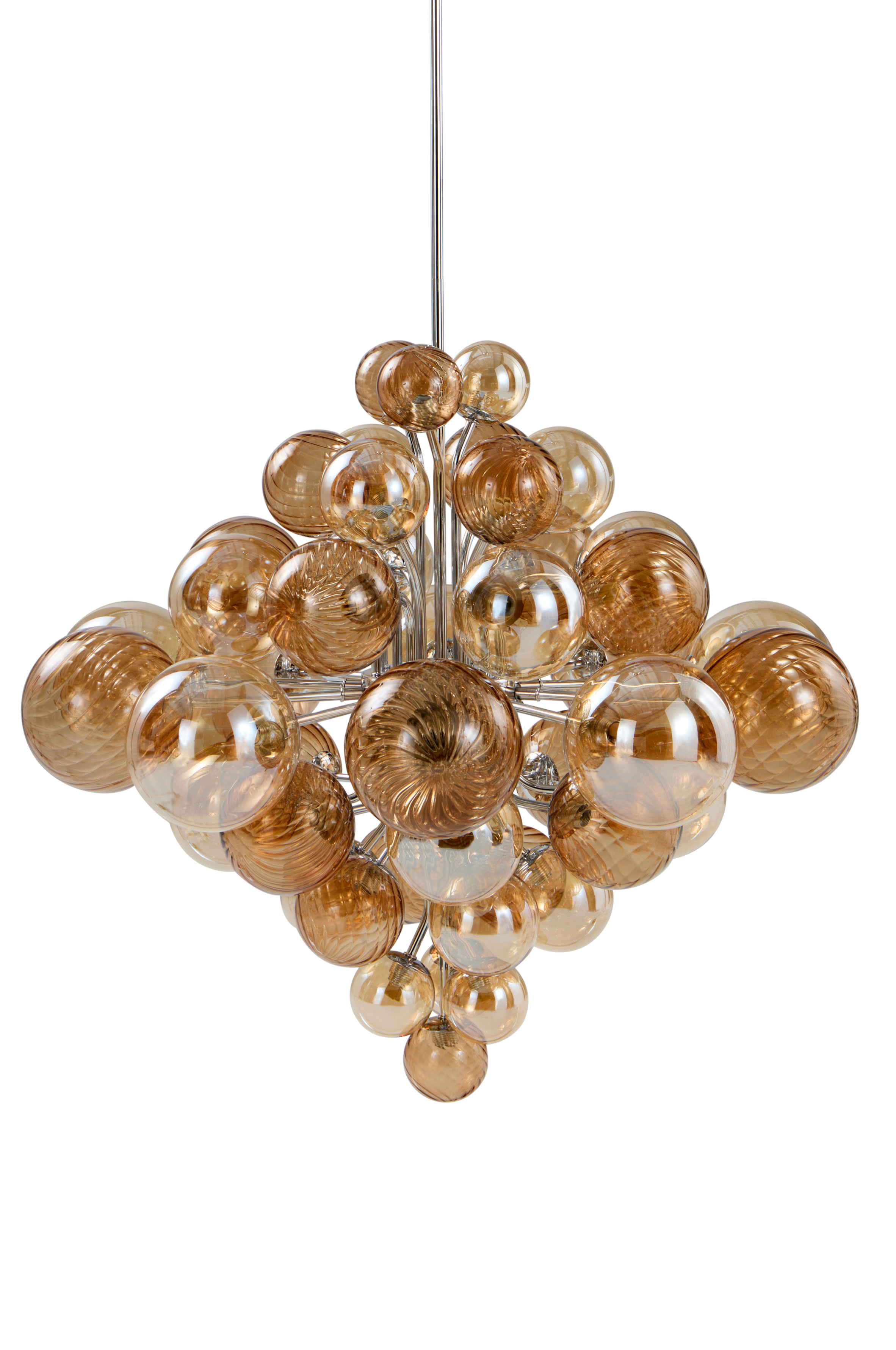 Kattovalaisin, jossa on kromattu rautarunko ja koristeelliset kirkkaat lasivarjostimet, jotka valaisevat kodikasta valoa sytytettäessä. Läpinäkyvä, johdon pituus 0,72 m.