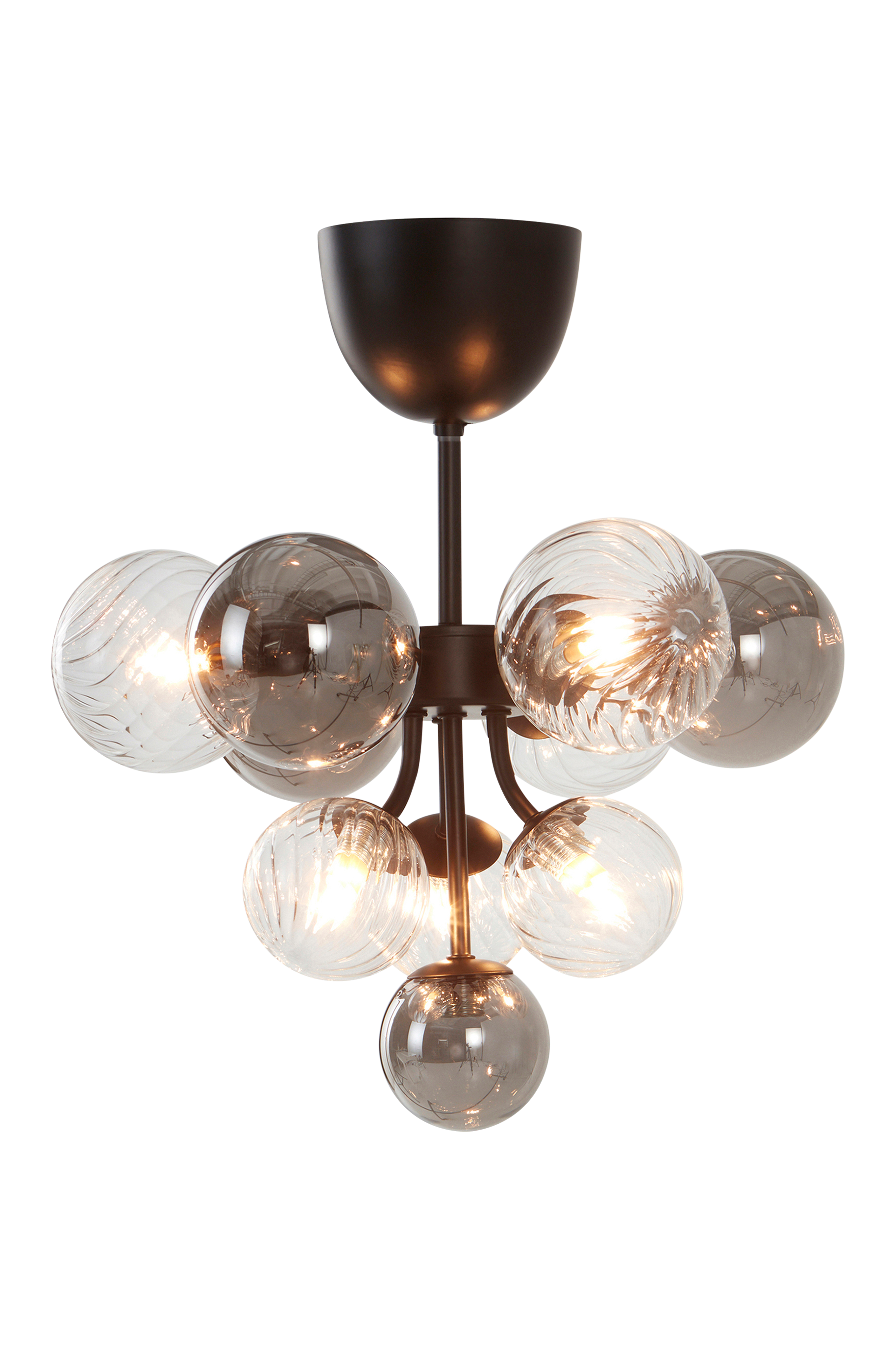 Kattovalaisimen runko rautaa, jossa krominvärinen pinta, ja koristekuvut kirkasta lasia, jotka levittävät tunnelmallista valoa. Kattopistoke ei sisälly toimitukseen uusien EU-sääntöjen vuoksi. Se on ostettavissa erikseen ja on nimeltään ROOF EARTH -kattopistoke.